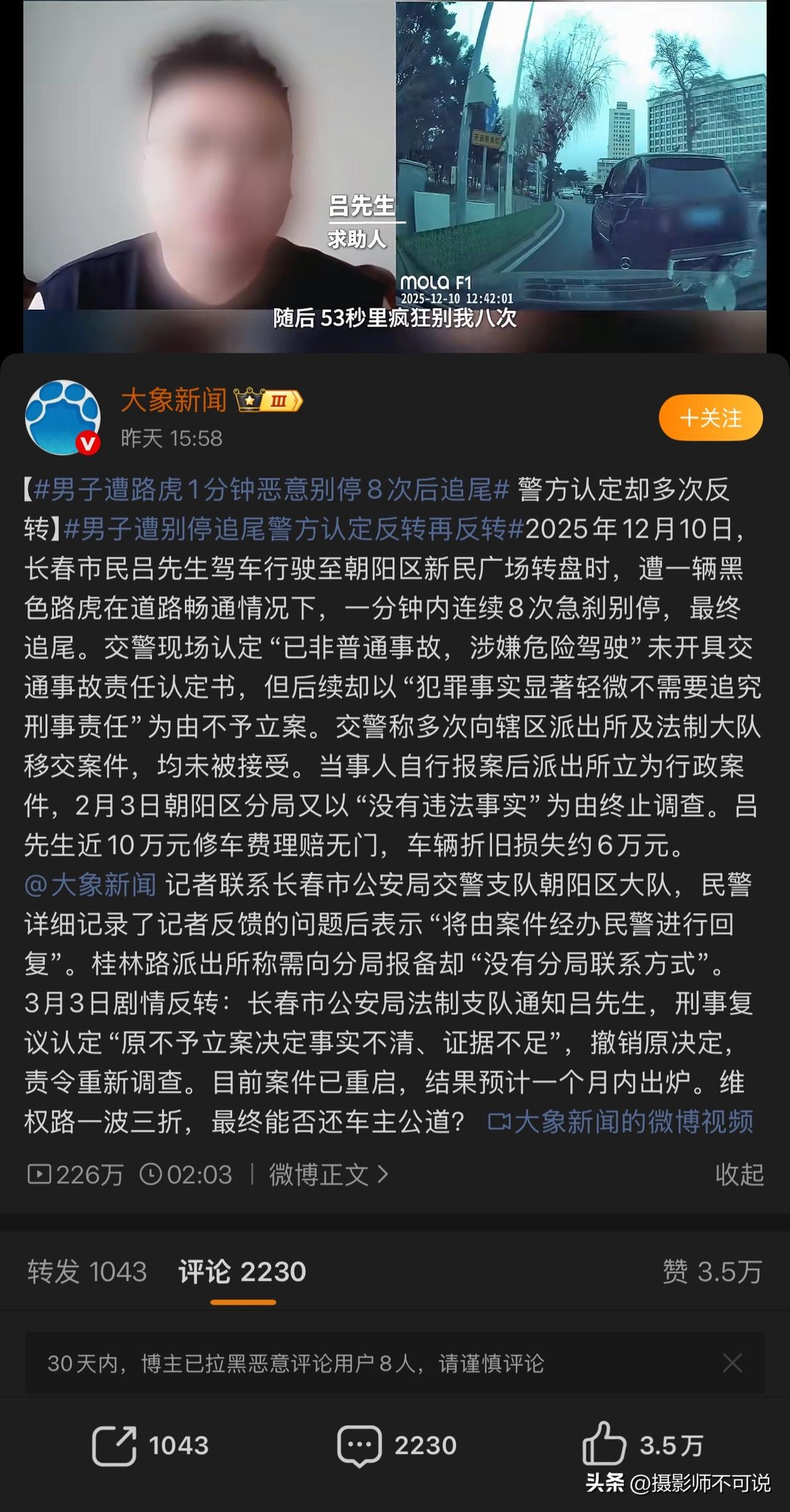 路虎车一分钟八次恶意急刹车别车这事儿听听就让人气愤,这得多大仇多大怨才能干出这种事儿来,关键这位路虎车主现在啥事儿没有一点,连基本的处罚都没有,这也是蹊跷之极了!这中间可能涉及到一些专业范围的处理方式或者程序,也许是钻了空子,作为吃瓜群众我也不是很清楚,事情未到水落石出,谁知道会不会有什么反转呢?只是从目前披露的视频和新闻信息来看,这位路虎车主肯定应该受到相应的处罚才合理,否则那交通还不乱套了!现在这件事情闹得沸沸扬扬,网友们的反应也异常激烈,所以这事儿应该会很快出结果,咱们就坐等水落石出吧!