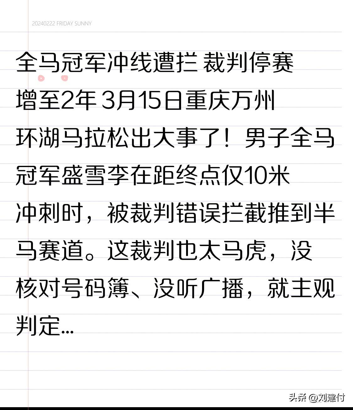 全马冠军冲线遭拦 裁判停赛增至2年 3月15日,重庆万州环湖马拉松赛场上突发意外。男子全马冠军盛雪李在距终点仅10米冲刺时,被裁判错误拦截,推到半马赛道。该裁判工作马虎,既未核对号码簿,也未听广播,仅凭主观判定行事。好在工作人员和观众及时提醒,盛雪李才得以重返赛道并夺冠。 事后,组委会解释称雨水遮挡了裁判视线,导致误判,裁判也进行了致歉,盛雪李表示理解。然而,此事影响较大,中国田协追加处罚,将该裁判停赛期增至两年,并通报批评了赛事组委会。 全国马拉松赛事密集,此次事件为各赛事组委会和裁判员敲响了警钟,必须严格执行规则,保障赛事公平公正。