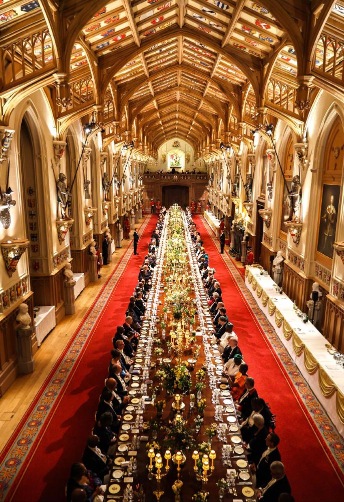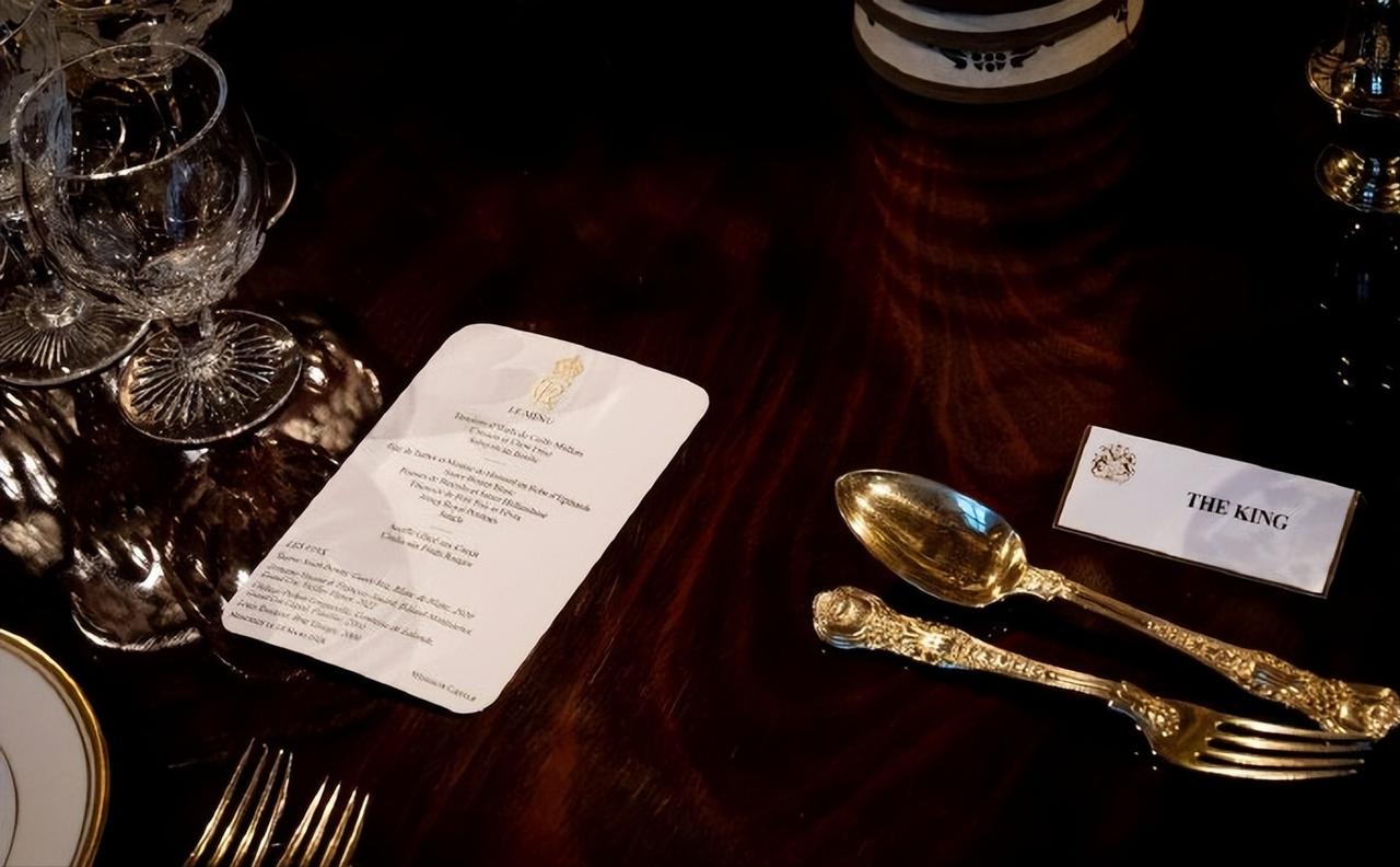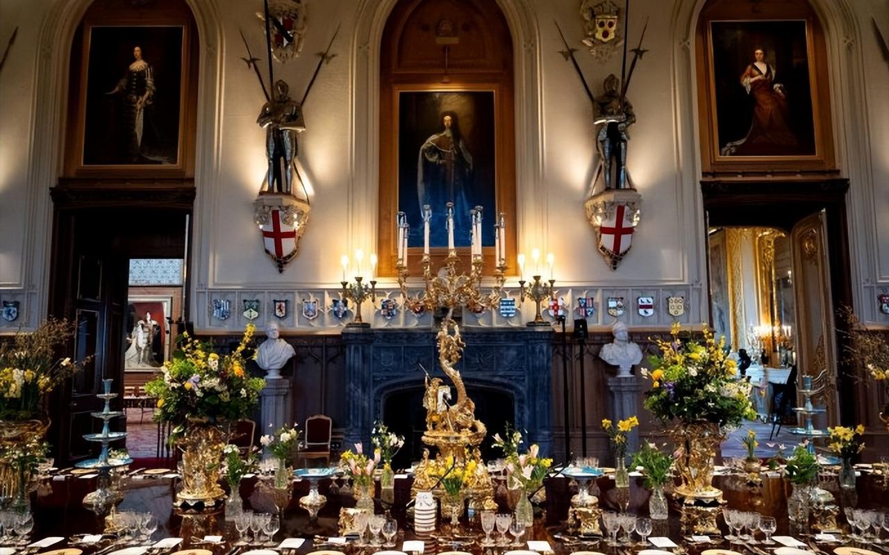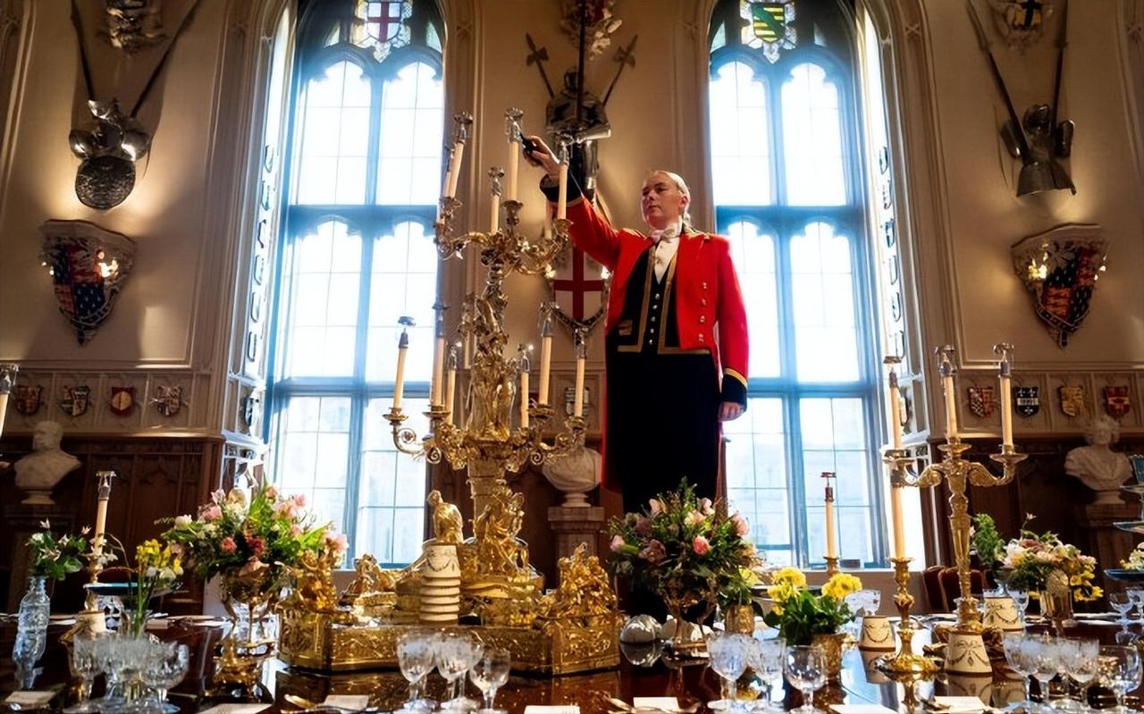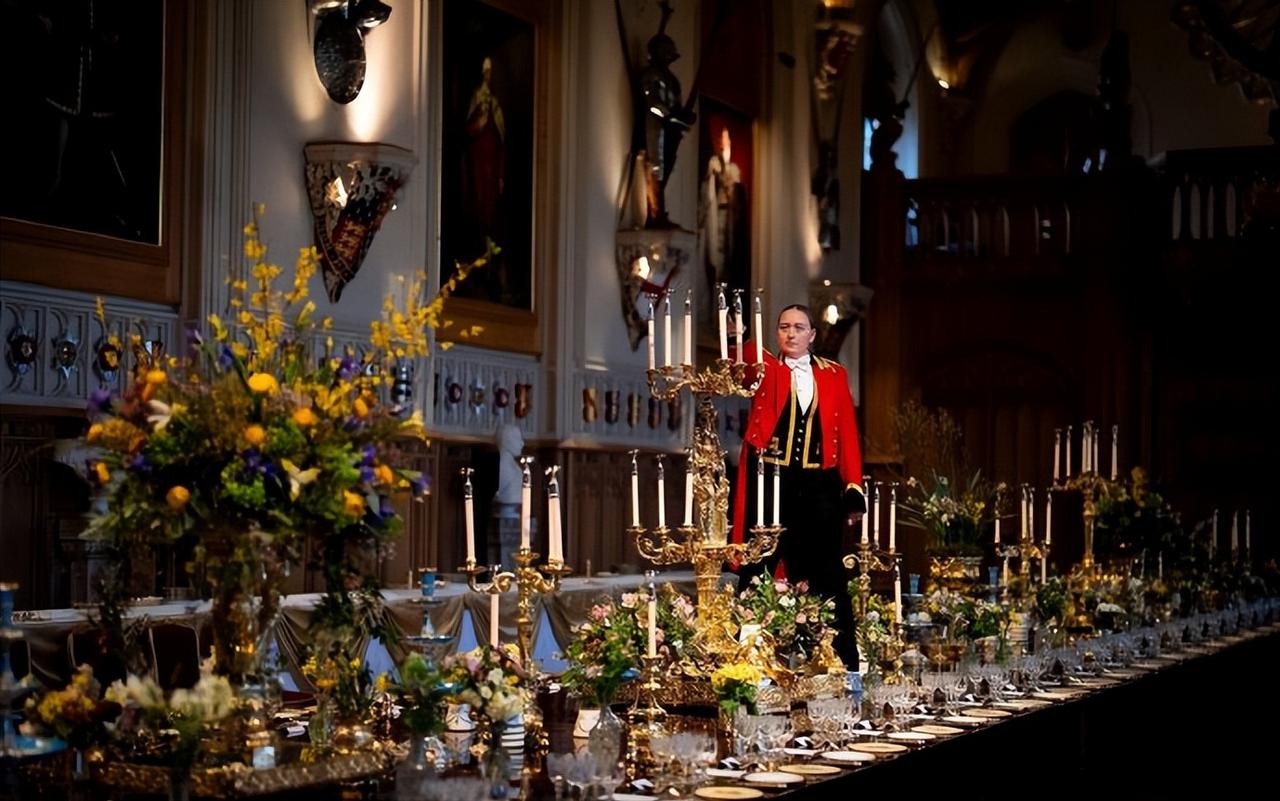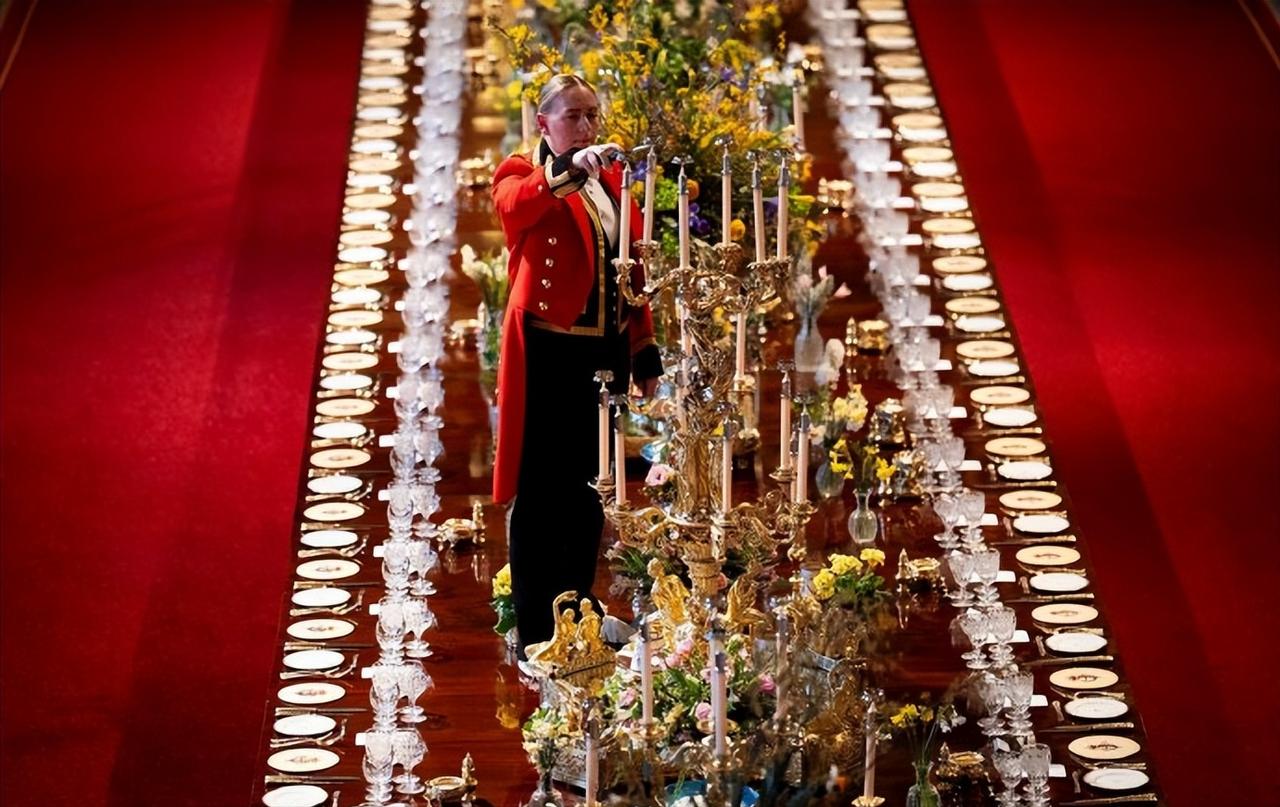 英王室欢迎尼日利亚总统的国宴,现场筹备的照片曝光! 这组照片是3月18日,查尔斯国王在温莎城堡为欢迎尼日利亚总统的来访,所布置的宴会大厅照片。 50米长的长桌,金碧辉煌的宴会大厅,地上铺着红红的地毯,水晶灯泛着璀璨的光泽,真不愧是王宫啊。 大到宴会厅的金碧辉煌,小到杯碟餐具的精美华丽,无一不透着华贵。不过查尔斯这次的餐具选的竟然是伊丽莎白女王的嘉德勋章图标的,让人诧异。 不过最让我好奇的是,一切准备就绪,杯碟也都安放齐整,工作人员踩在桌子上点高高拜访的烛台。 很好奇,这些人员是怎么操作的,一路踩着宴会桌走来走去?脚下就是客人们用的餐具,不膈应吗?