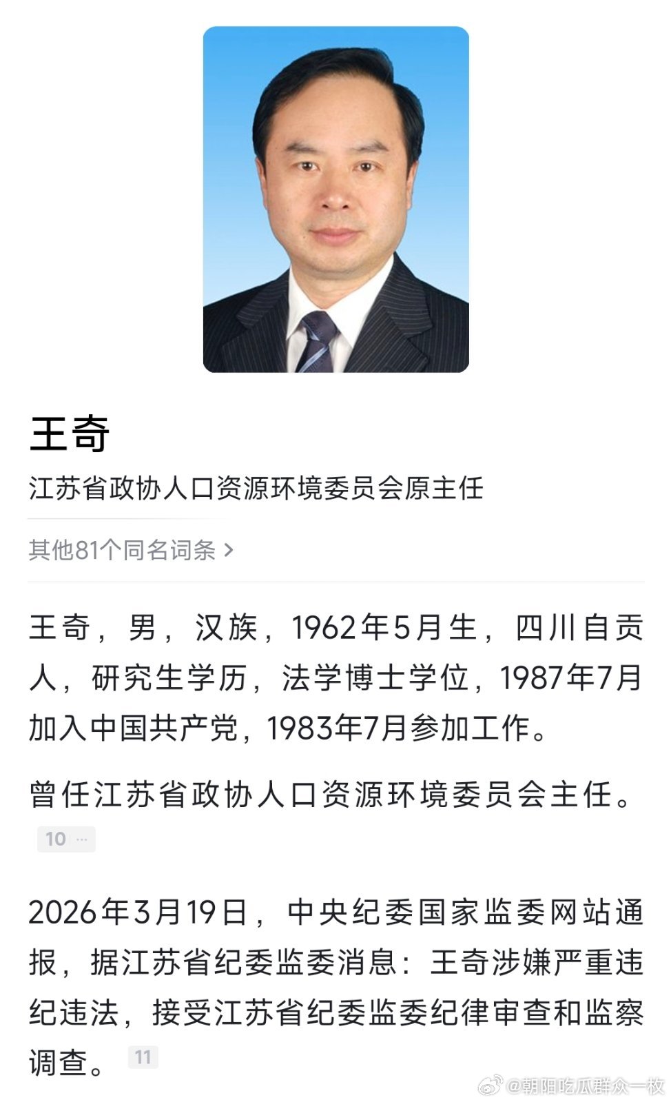 江苏省政协人口资源环境委员会原主任王奇接受纪律审查和监察调查。