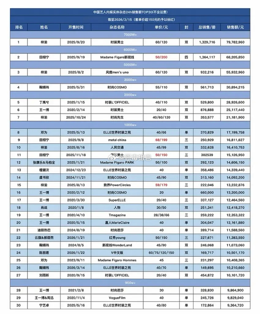 看到内娱一个个用杂志来鉴爆想到梓渝时装男士销售额7978w➕的含金量开售10分钟销量92w➕ 销售额5500w➕开售1小时销量99w➕ 销售额5958w➕开售24小时销量132w➕ 销售额7978w➕谁不说一声梓渝杂顶 内娱杂志标杆 梓渝