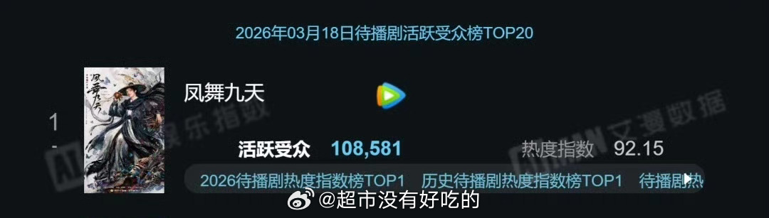 3.18艾漫待播剧活跃受众榜龚俊《凤舞九天》又登顶第一陆小凤角色占比第一,热度一天比一天高凤舞九天这个剧组有龚俊了不起龚俊龚俊