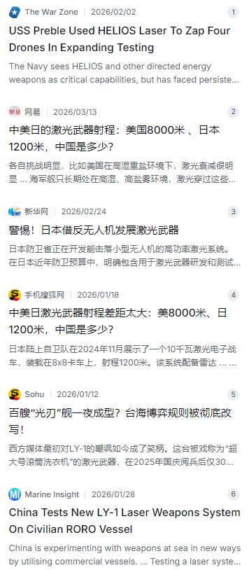中美日的激光武器射程差距太大:美国8000米 、日本1200米,那中国是多少? 麻烦看官老爷们右上角点击一下“关注”,既方便您进行讨论和分享,又能给您带来不一样的参与感,感谢您的支持! 最近几年,激光武器从科幻电影里逐步走向真实战场,成了大国博弈的新焦点。这种武器一旦开火,不需要考虑弹药够不够,只要有电就能持续打,关键是拦截成本极低,用导弹打无人机可能要花上百万美元,用激光只需要几美元电费。面对这种改变游戏规则的装备,中美日三家的路子却完全不一样。 美国海军这几年确实下了不少功夫,最拿得出手的就是HELIOS系统,装在“普雷贝尔号”驱逐舰上进行测试。按照洛克希德·马丁公司的说法,这套60千瓦级的激光器不仅能致盲对方的光学传感器,还能硬杀伤直接摧毁目标,最大射程能到8000米左右。在去年的一次测试中,它甚至一口气打掉了四架无人机,这标志着美国舰载激光武器具备了多目标交战能力。 但问题也很现实,激光这玩意儿最怕坏天气,尤其是在太平洋那种高盐雾、高湿度的环境里。美军高层自己都承认,虽然目标是让激光成为舰艇防空的“首选武器”,但实际使用中光束衰减严重,光学器件还容易被腐蚀。说白了,在实验室或者晴朗天气里打8000米没问题,一旦到了波斯湾或者菲律宾海这种湿气重的地方,有效射程很可能直接腰斩。 美国海军作战部长去年甚至直言,对目前激光武器的研发进度感到“尴尬”。这话听着挺扎心,但确实是实情,技术上虽然有突破,可离大规模实战部署还有不少坎要过。现在只有“普雷贝尔号”一艘舰装了HELIOS,其他驱逐舰配的都是功率更低的ODIN系统,主要功能还停留在致盲对方传感器,没法直接摧毁目标。 日本这边走的是完全不同的路线。受限于“专守防卫”的基本国策,日本在发展激光武器时非常克制,主攻方向就是近程防空,专门对付无人机和小型目标。三菱重工搞的那套10千瓦级车载激光系统,2023年公开测试时,在1200米距离上干净利落地击落了一架无人机。 这套系统的亮点不是打得远,而是打得便宜。单次发射成本只有几百日元,折合人民币也就几十块钱。日本人的算盘打得很精,与其跟大国拼远射程、拼大功率,不如先把家门口的便宜无人机拦住。毕竟现在的战场上,几百架无人机蜂拥而至是常态,用导弹打根本打不起。 不过这套系统的短板也很明显,功率只有10到20千瓦,碰上稍微大一点的目标或者恶劣天气就抓瞎。日本防卫省自己也清楚这一点,所以正在加紧研发100千瓦级的舰载激光系统,已经装到了“飞鸟号”试验舰上进行测试。这套系统是把多个10千瓦级的光纤激光器拼在一起,目标是把射程提升到5000米左右,但距离实战还有很长的路要走。 中国这边的发展路子很有意思,不盲目追求极限射程,而是强调可靠、能用、好用。2018年珠海航展上首次亮相的LW-30,功率30千瓦,射程三四公里,当时看着中规中矩,但它的意义在于解决了“有没有”的问题。到了LW-60,功率直接翻倍到100千瓦,射程拓展到6000米,关键是散热瓶颈有了突破,采用模块化液冷技术,能连续作战。 真正让外界刮目相看的是LY-1舰载激光系统。这套系统功率据说能达到180到250千瓦,射程覆盖10到20公里,具备拦截超音速反舰导弹的潜力。但比这些数字更重要的是实战验证,2022年“寂静狩猎者”系统在沙特打出了名堂,一天之内击落13架胡塞武装无人机,后来又累计击落36架,命中率百分之百。 这意味着什么?意味着中国激光武器不是在实验室里“养尊处优”的娇贵玩意儿,而是在沙漠风沙、高温酷暑这种恶劣环境里真刀真枪干过的。沙特那地方热得要命,空气里沙尘还多,激光在这种环境里最容易衰减,但“寂静狩猎者”顶住了,这个实战成绩比任何PPT都更有说服力。 更值得一说的是中国的设计思路,激光武器不是孤零零的存在,而是融入整个防空体系。雷达发现目标,指挥系统分配任务,激光器负责最后拦截,这种体系化作战的能力让激光不再是“样子货”,而是真正能顶上去的硬家伙。而且中国在搞模块化,把激光系统做成集装箱大小,民船上也能装,真到了需要的时候,庞大的民船队随时可以变成移动防空平台。 回过头来看这三家的差异,本质上是战略诉求不同。美国要维持全球霸权,航母编队需要远程防护网,所以拼命追求8000米以上的射程,想把威胁挡在远处。但这种追求在复杂环境面前屡屡碰壁,理论上的优势在实际作战中要打折扣。日本受限于宪法和政治环境,只能守着“专守防卫”过日子,1200米的射程够用就行,关键是成本低、能快速部署,适合岛链防御。中国的路子最务实,不跟风拼参数,而是扎扎实实解决环境适应性、连续作战能力、体系融合这些真问题。