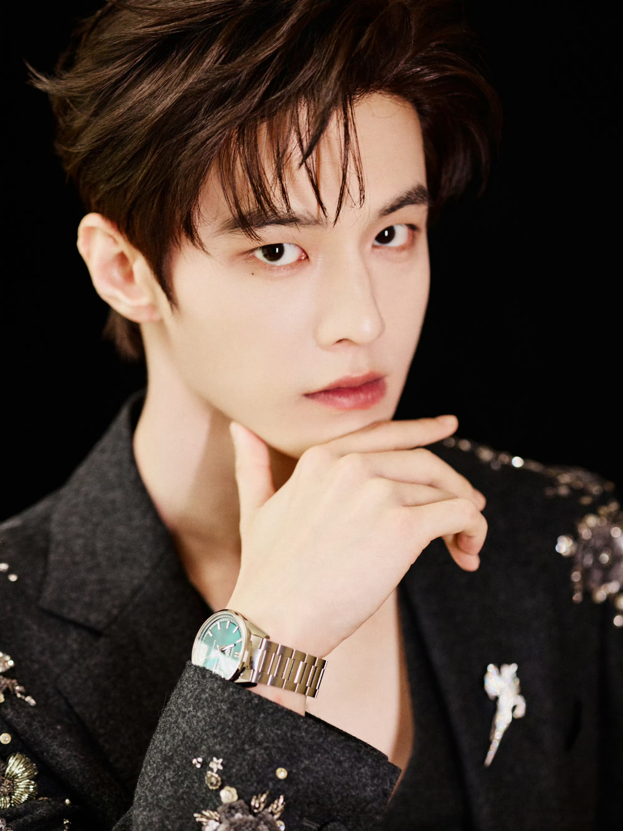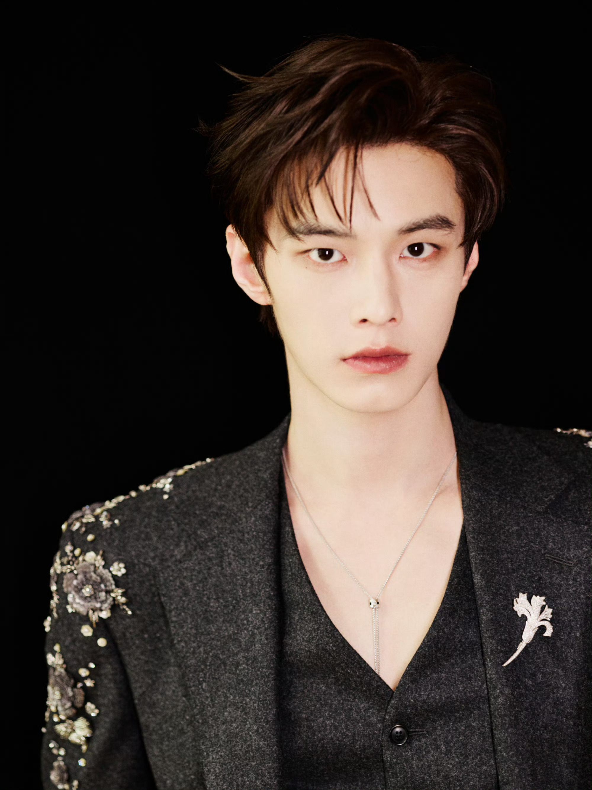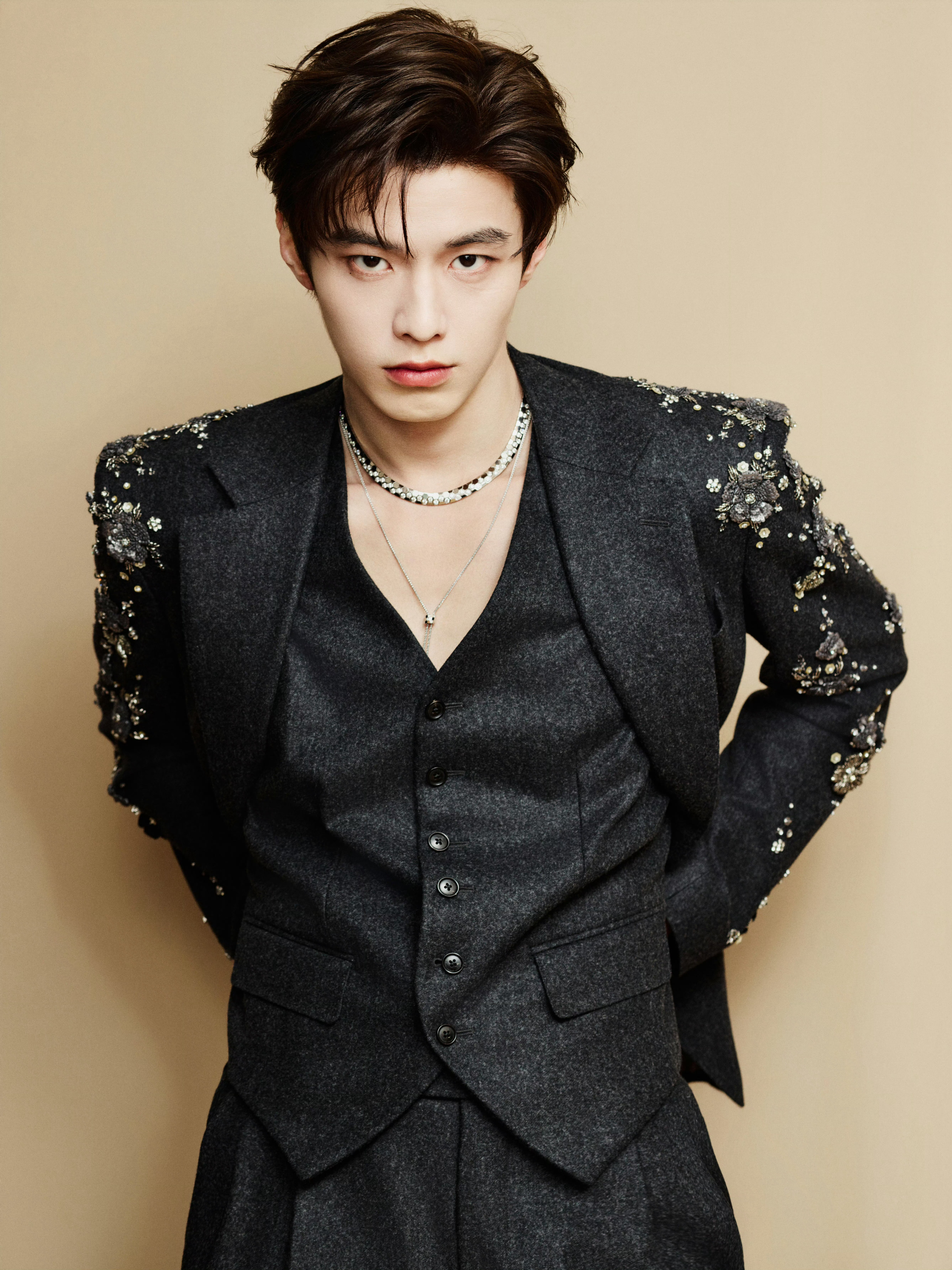 现身耀客华影耀彩新剧盛典,身着三件套西装——利落剪裁勾勒挺拔轮廓,肩袖处采用重工钉珠刺绣细节,哑光毛呢材质与亮饰元素相互映衬。