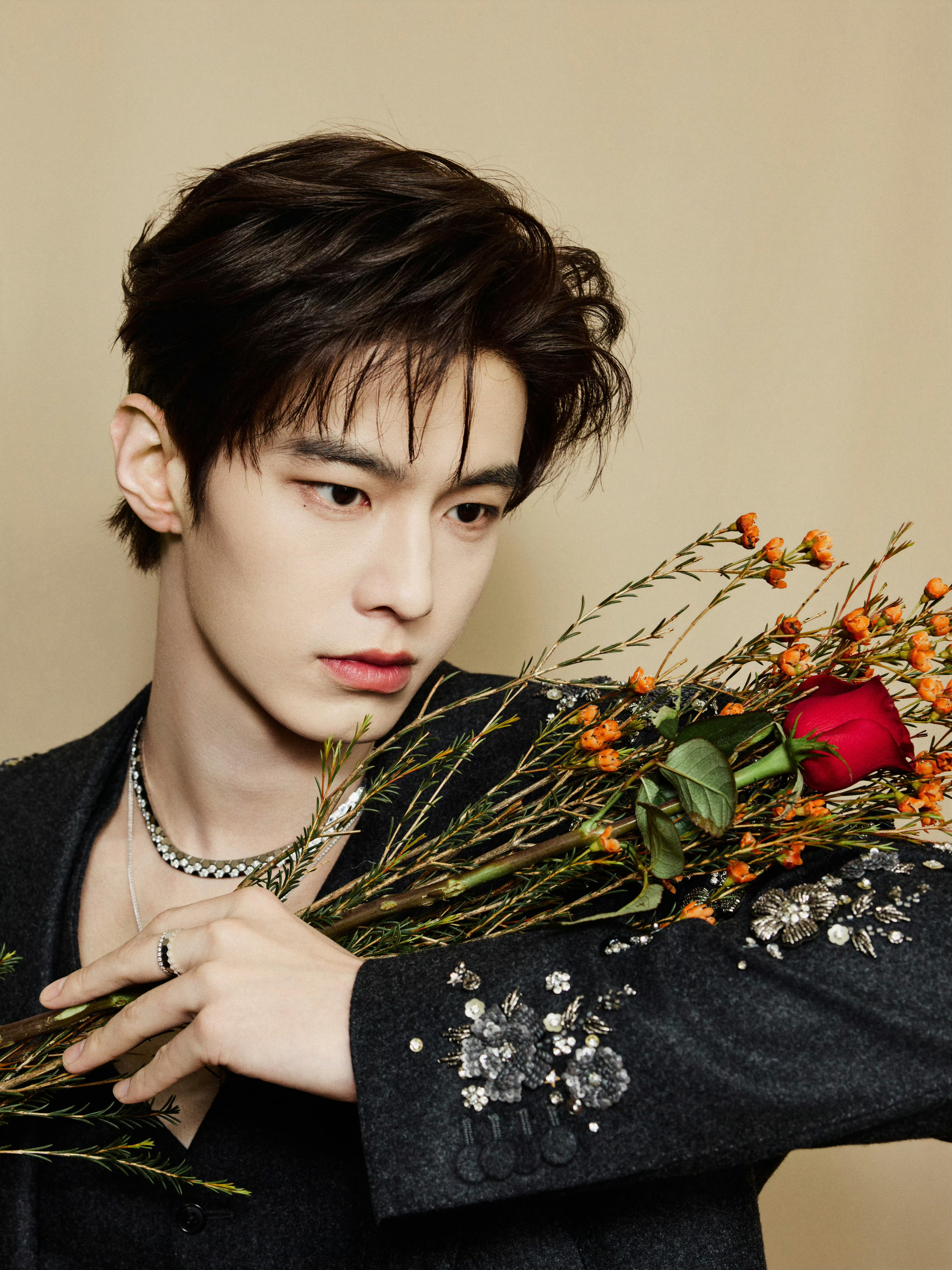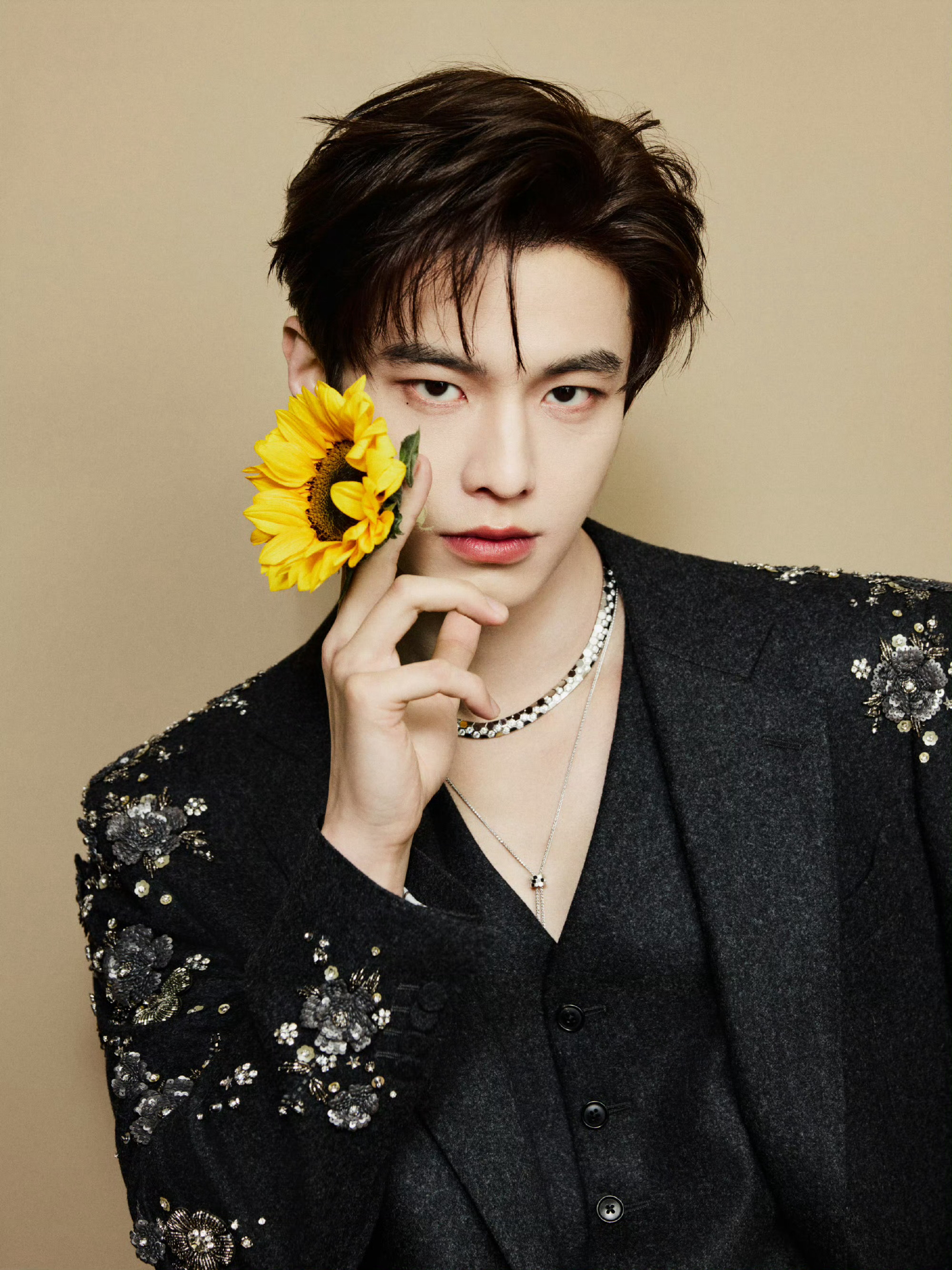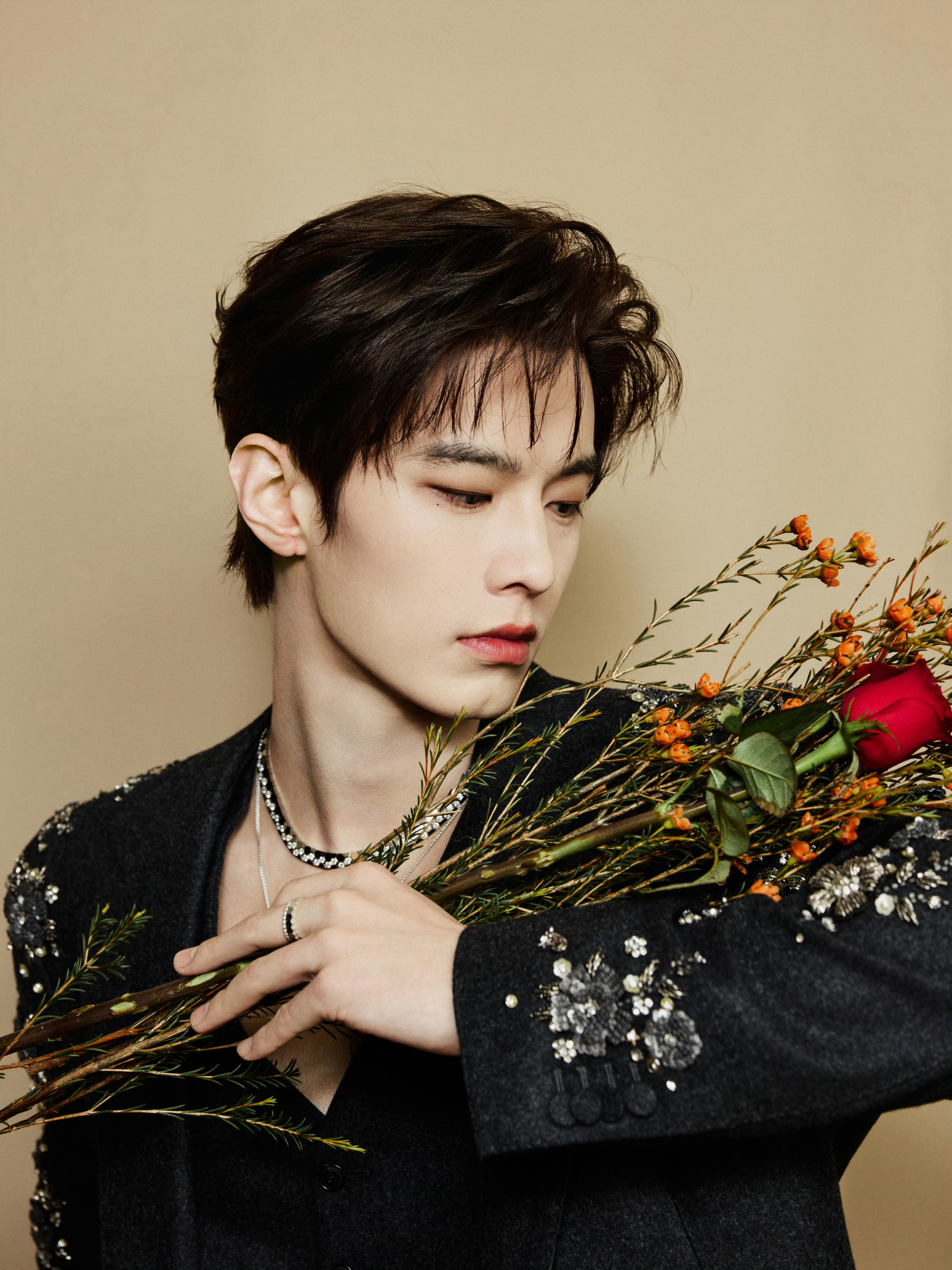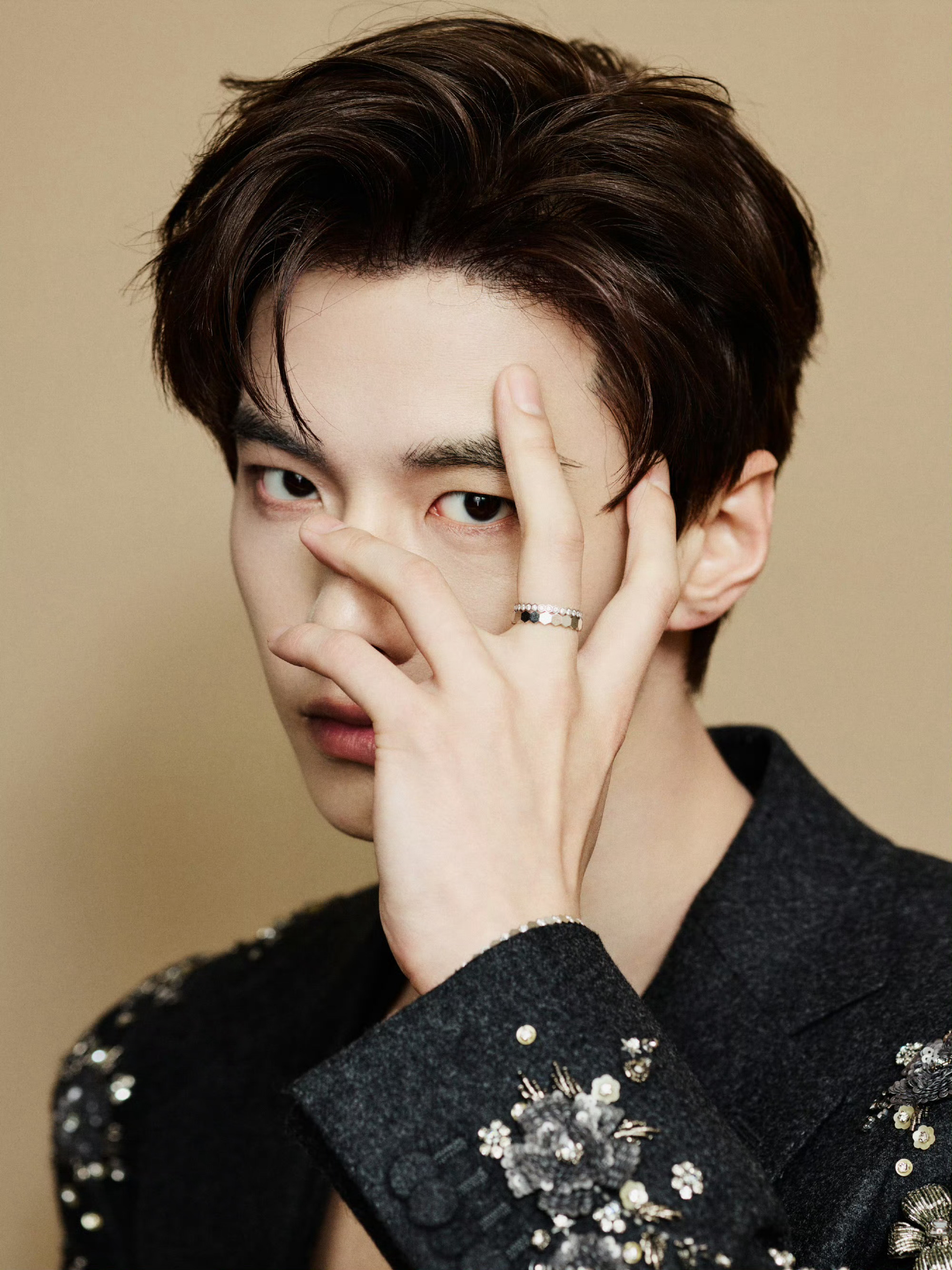 现身耀客华影耀彩新剧盛典,身着三件套西装——利落剪裁勾勒挺拔轮廓,肩袖处采用重工钉珠刺绣细节,哑光毛呢材质与亮饰元素相互映衬。