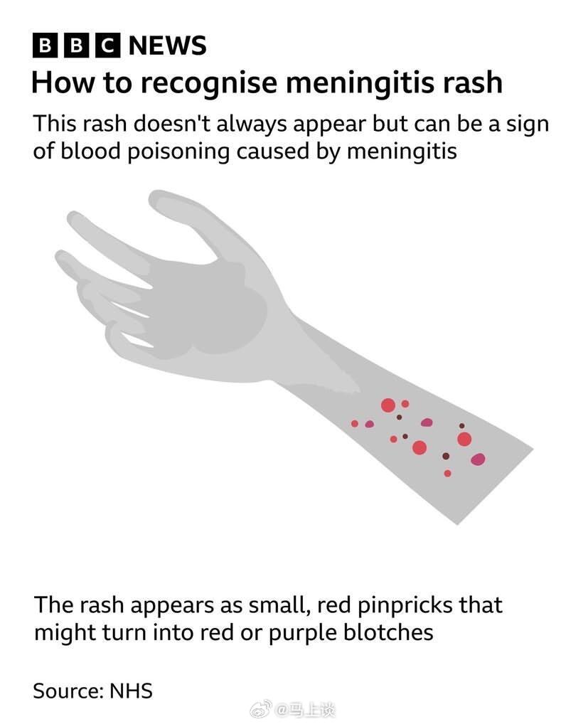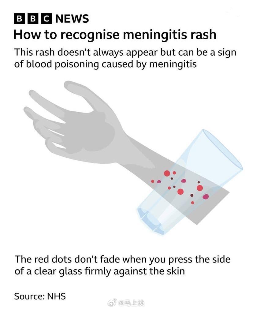 BBC和NHS联合发布的一组脑膜炎皮疹科普图,皮疹长什么样?一开始可能是小红点或针尖状出血点随后可能扩散成红色或紫色斑块注意:皮疹不一定会出现,但如果出现,是紧急信号