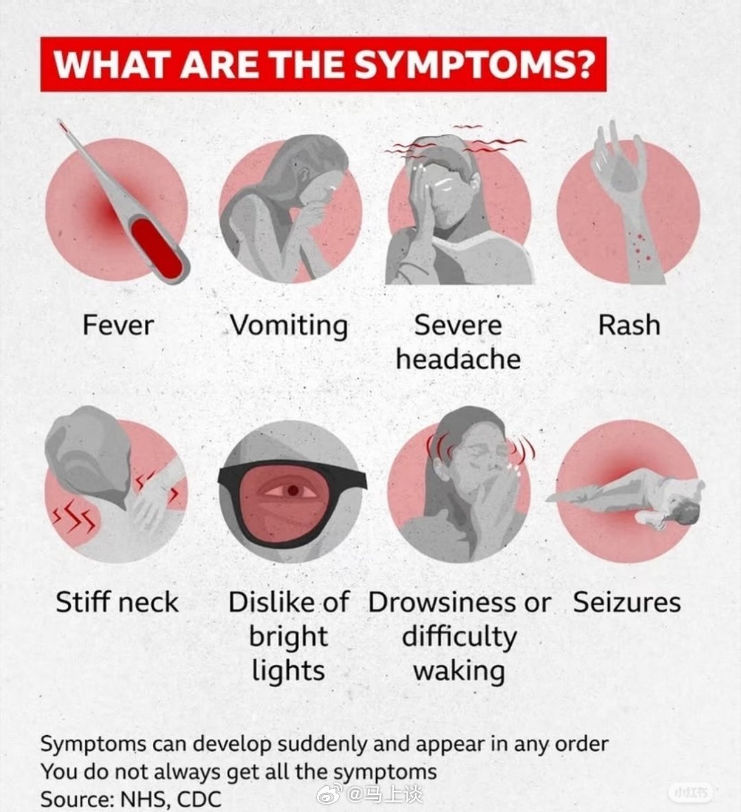 早期症状包括:高烧剧烈头痛颈部僵硬恶心呕吐畏光严重时可能在数小时内恶化身在在英国法国的你,可以做这些:不要共用电子烟、饮品减少高密度社交特别是夜店、party有症状立刻就医关注学校/NHS通知