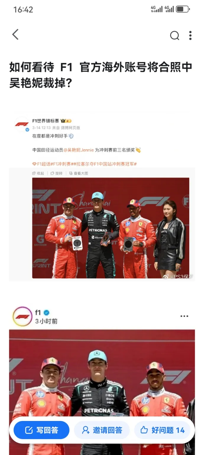 吴艳妮蹭合影,被F1海外官方账号裁掉,大家怎么看?