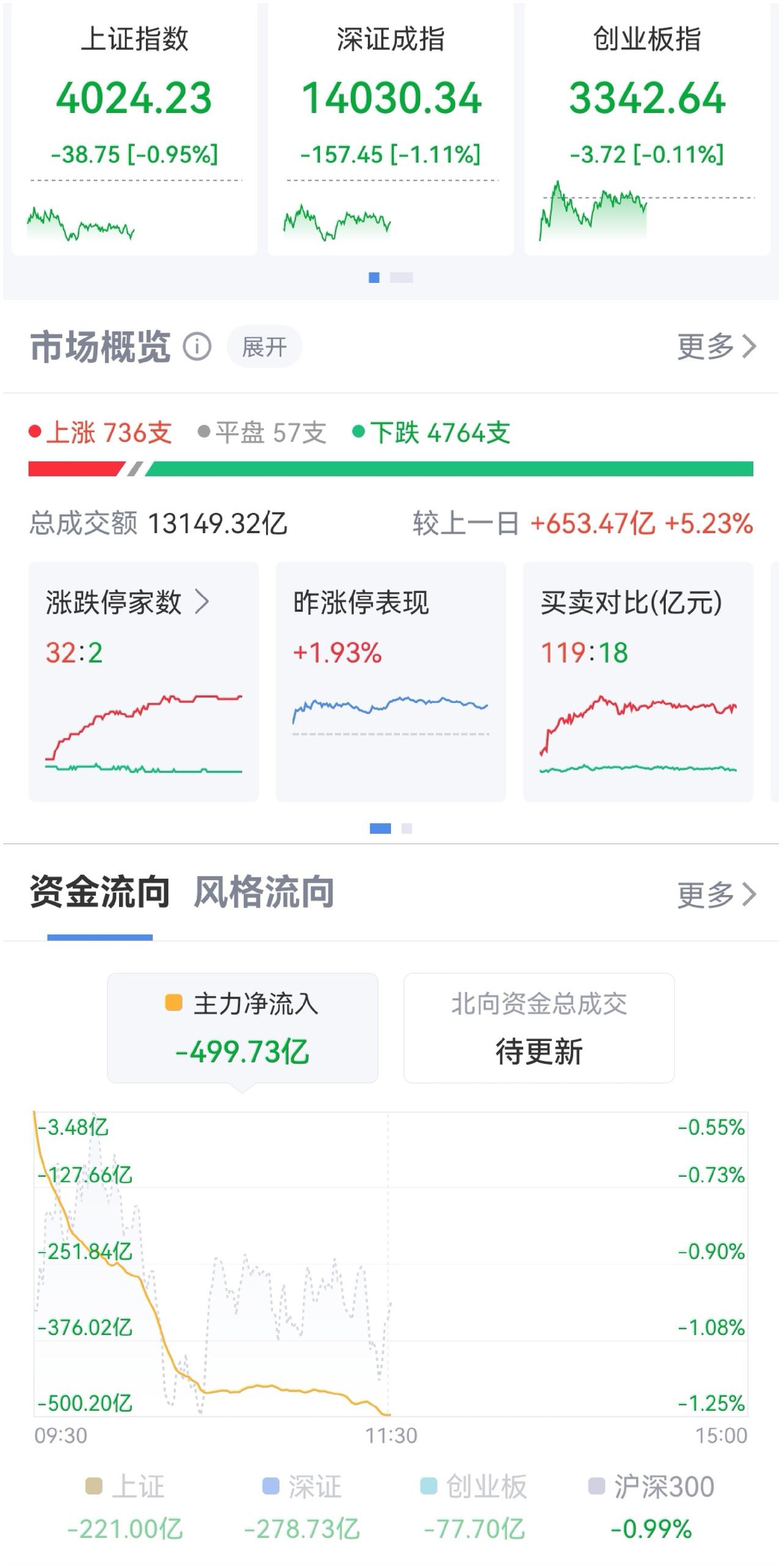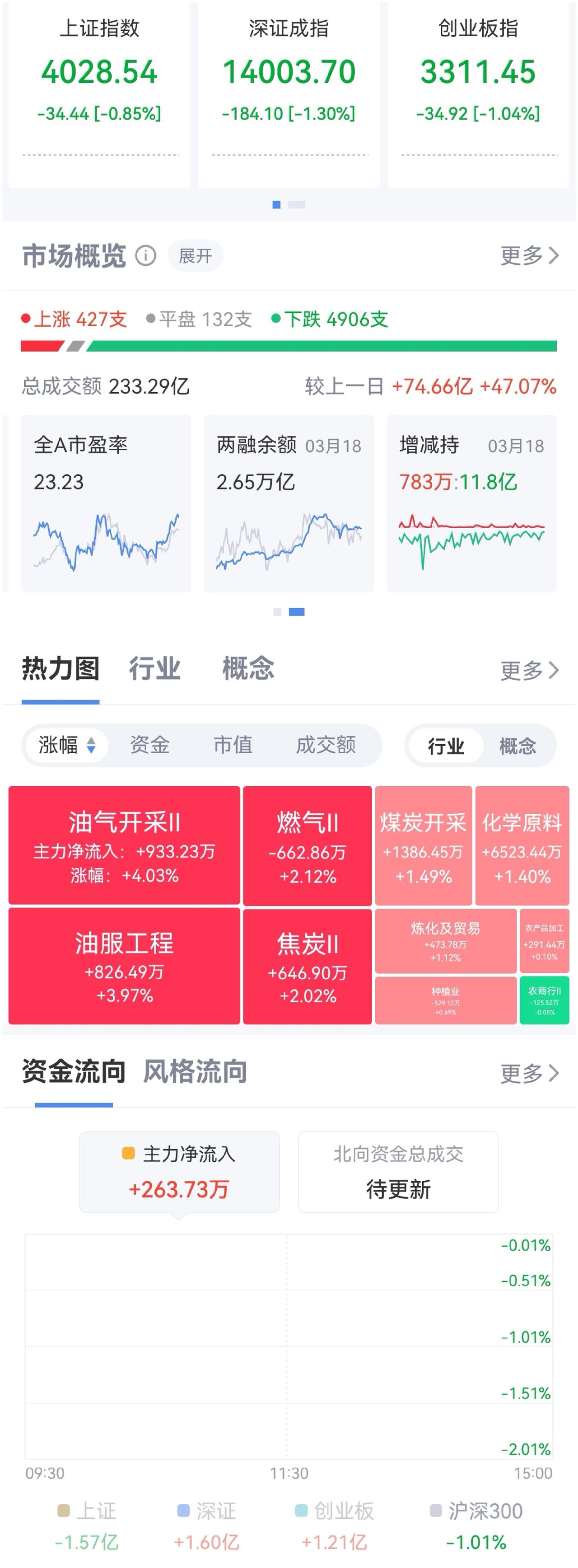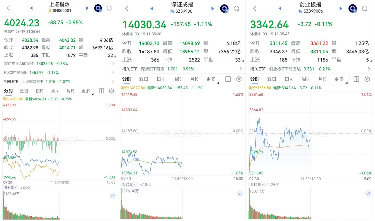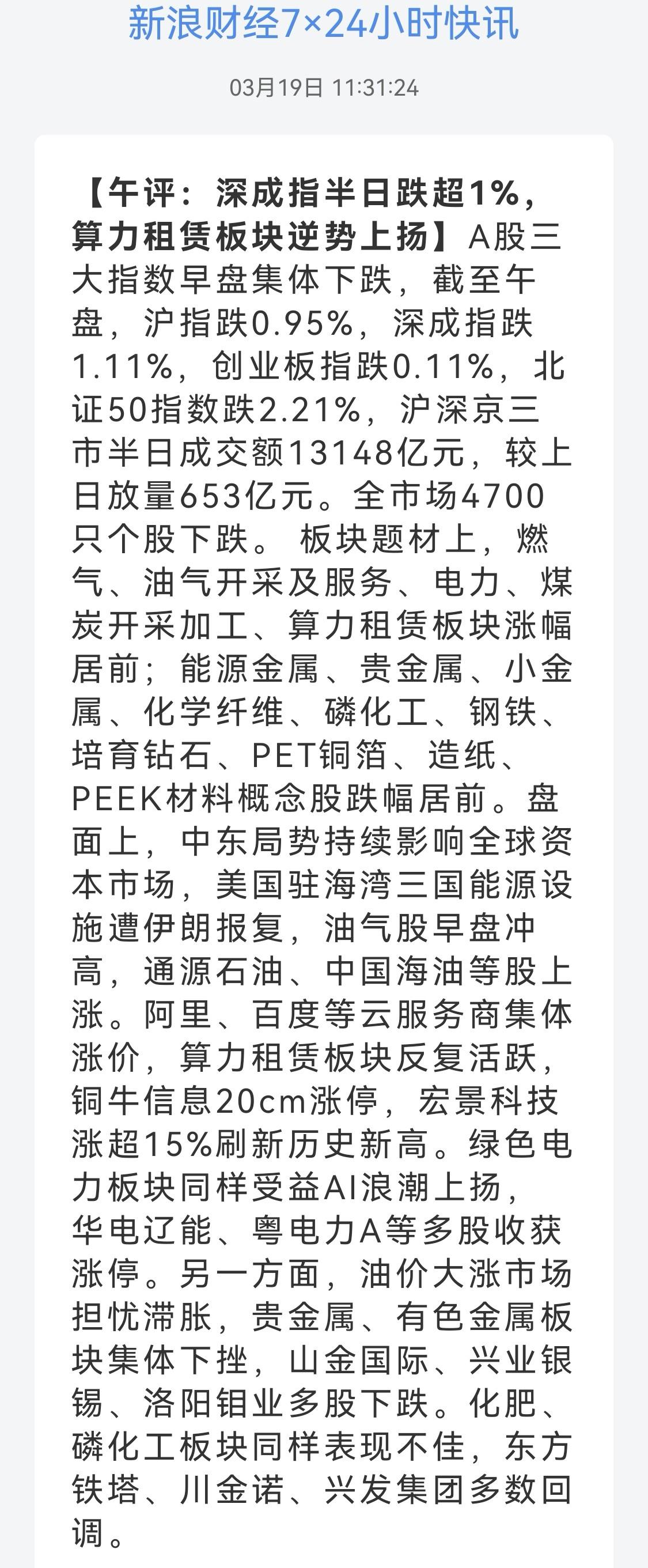 午盘印象(3月19日) 低位震荡 CPO强势 外围:战事又紧 美股下跌 科技调整 内股:情绪交易 调整未尽 科技抵触 一、三大股指开跌: 指数开跌 个股开盘涨平跌比率8%:2%:90%。 个股开盘强势(-82 Vs +27个百分点), 个股低开九成,颓势少见 二、早盘指数下跌又分化,创板强主板弱 半日1.3万亿,量能低位,主板回落 三、涨跌幅榜: 科技探底 红利护盘 非银调整 跌幅前列:金属、化工农化、机器人 涨幅前列:化石能源、红利 四、开盘和午盘: 开盘:沪-0.85%、深-1.30%、创-1.04%。 午盘:沪-0.95%、深-1.11%、创-0.11%。 指数分化 五、午盘个股下跌86%,与昨日涨跌差距( -72 Vs -4个百分点),个股大幅回调 相比开盘,涨跌差些微好转,上涨股增加 资金-500 ( -258)亿,资金流出大幅增加 六、沪深两市成交量午盘13,048亿,上个交易日12,399亿,同比量能扩张超600亿,反弹无力下跌中继,市场继续探底 七、指数个股稍企稳,信心未坚定 两融增减快速变换,市场震荡。昨日净增加+25亿,指数回暖 早盘指数弱势探底,CPO撑起创业板,主板弱于创板,主板低开低位震荡,创业板低开拉升又震荡。上证远离4095继续探底。量能稍许放出,午后低位震荡更可能 午后两种情形: 1、横盘震荡:低位震荡,量能不济,跌幅已深,时间换空间。 2、震荡回升:情绪交易,跌幅过大引反弹,大开大阖,慢牛格局未变。 (图片源自网络侵权告知删除)