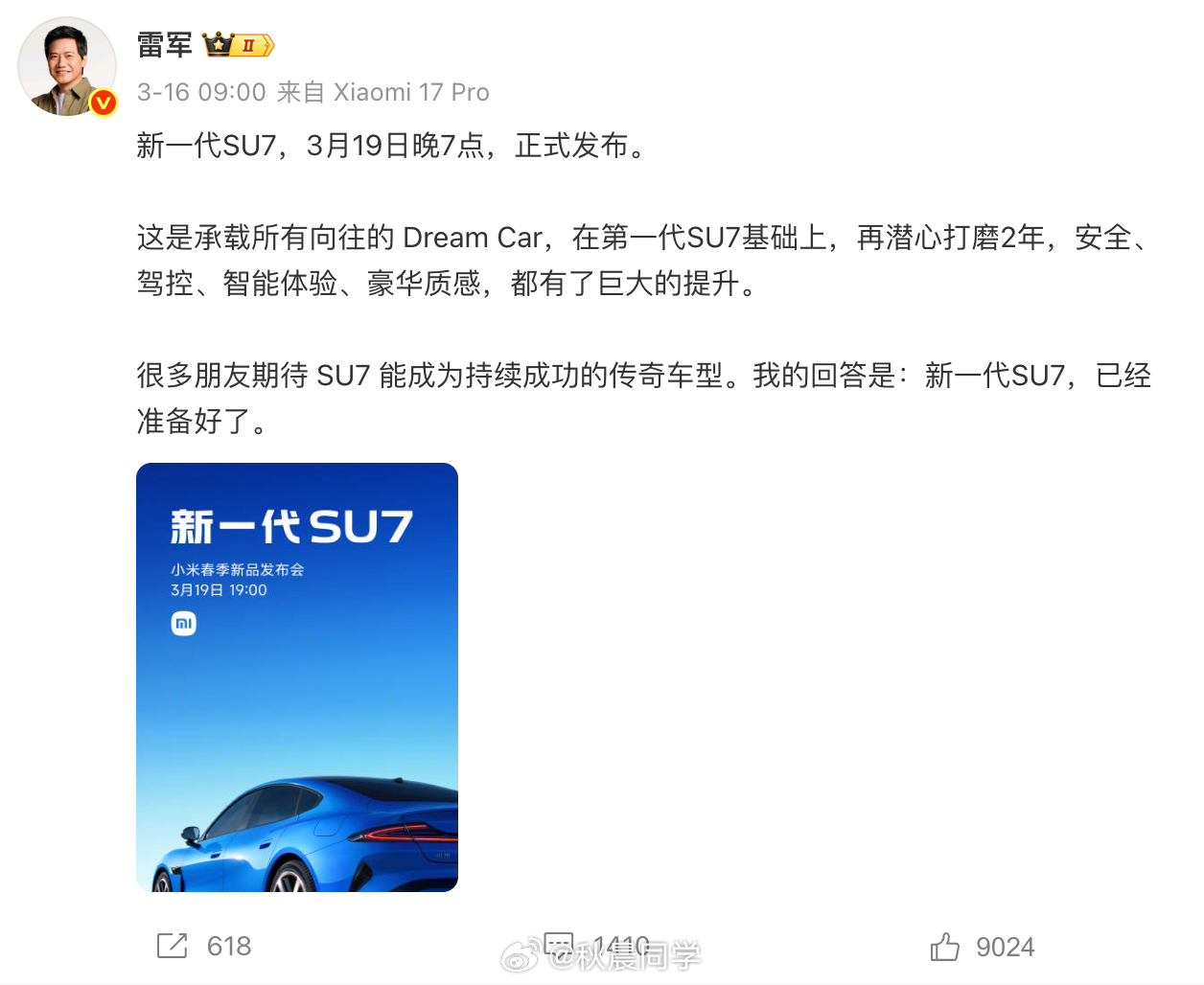 新小米SU7今晚上市,雷总之前透露会涨价新车预售价22.99万起老规矩,咱评论区猜起售价,精准到xx.xx万前三个猜中的好朋友,直接发66元红包 小米新一代SU7今日发布