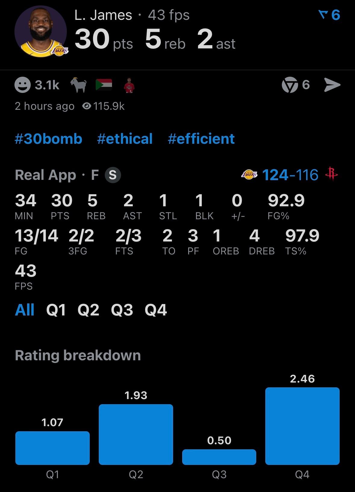 全场出战34分钟,14投13中,三分2中2,3罚2中,得到30分5板2助攻1盖帽!本赛季赛季最佳一战!👑👑👑👑🔥🔥🔥🔥