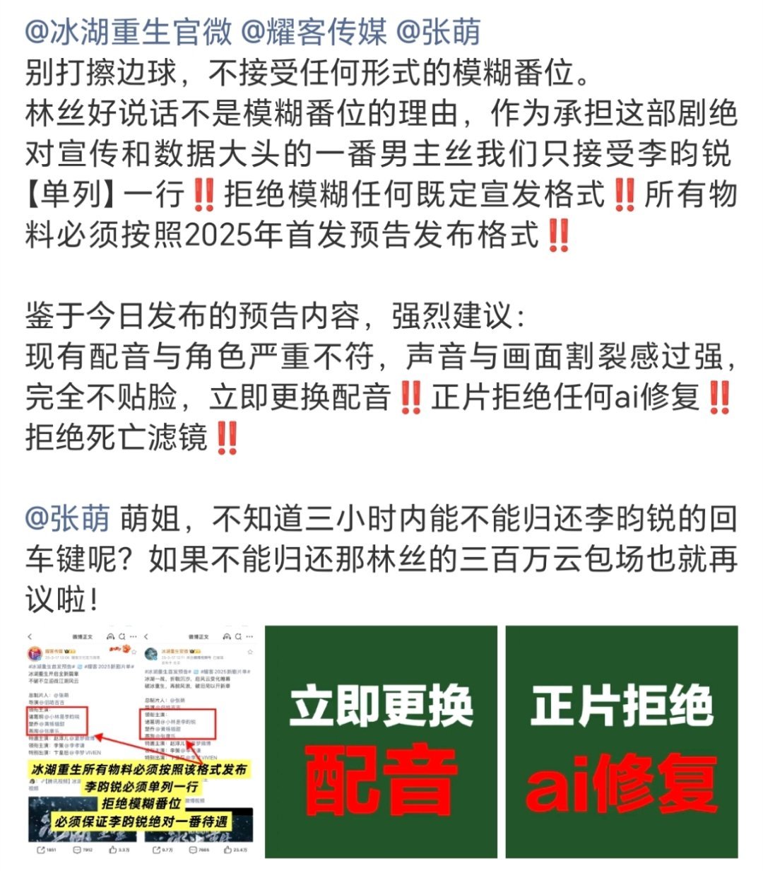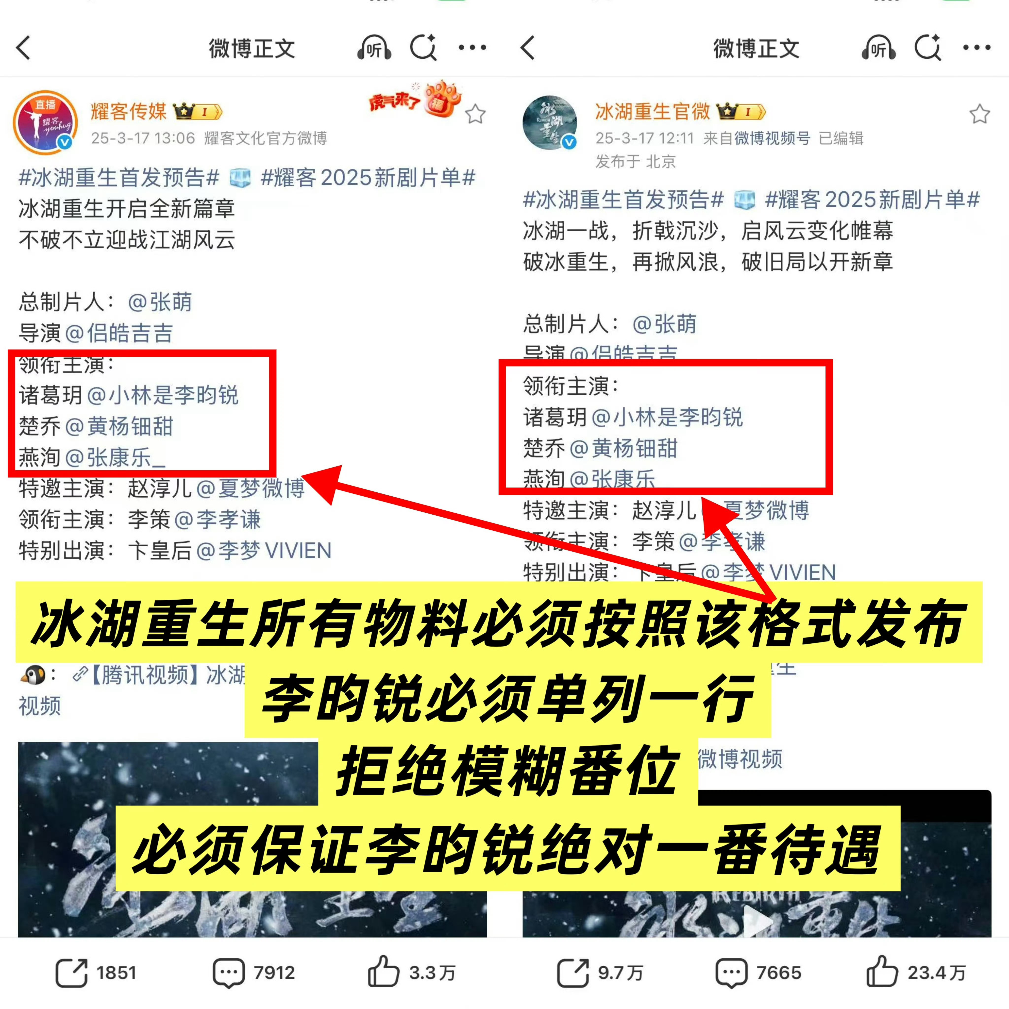 李昀锐粉丝向《冰湖重生》维权。看了下小森林门说的点,模糊番位确实谁都难以接受,小林从一开始就是单独一行大回车的
