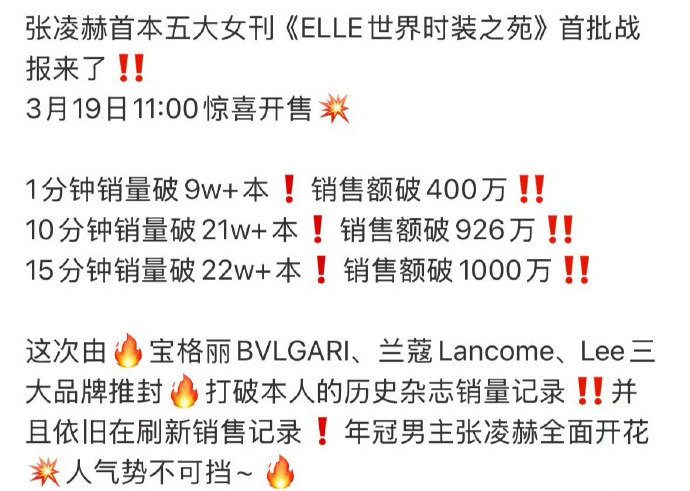 张凌赫杂志销量15分钟破千万 张凌赫ELLE的销量战报张凌赫ELLE的销量战报,