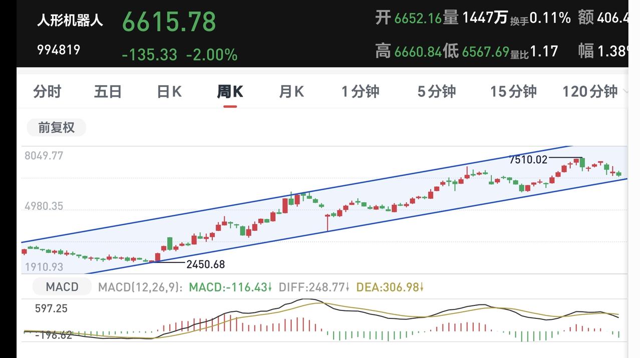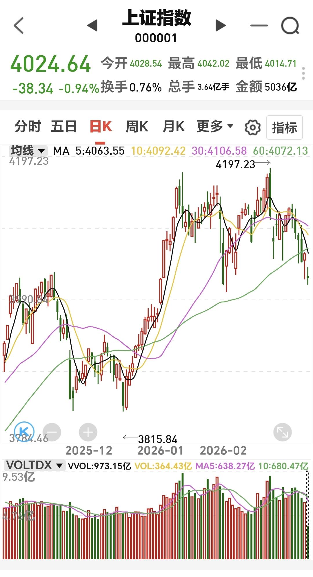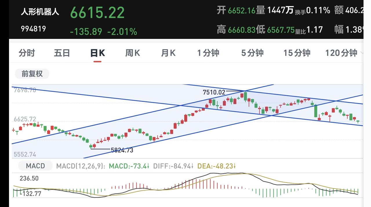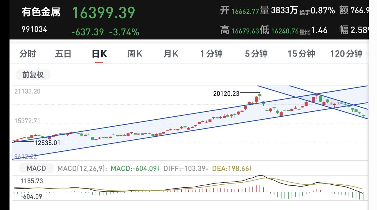基金:这两个板块连续下跌了六天 今天市场低开以后小幅度震荡,盘中最高4042点,最低4014点,上下只有28个点的震荡幅度,需要注意的是,盘中最低4014点已经创4197点以来的新低,后面继续观察会不会跌破4102点,以及3977点至3983点的缺口会不会被回补。 现在黄色线还是在蓝色线的下方,但两条线之间的敞口已经缩小,这是一个好的现象,如果两条线之间的敞口能够进一步缩小,下跌幅度不排除能够继续缩小。 两市累计成交11617亿,相比于昨天同期放量了7%,市场上涨799家,下跌4627家,上涨家数少于下跌家数,涨停32家,跌停4家,主力资金净流出500亿,今天到现在为止的跌停家数只有四家,这说明盘面根本没有出现恐慌的现象。 整个市场上涨幅度最大的三个板块是:煤炭板块,电力板块,通信板块,下跌幅度最大的三个板块是:有色金属板块,黄金板块,稀土永磁板块,黄金股板块和稀土永磁板块连续下跌了七个交易日,有色金属板块,化工板块和新能源板块也已经连续下跌了六个交易日。 持有基金现在盘中估值亏损了5376元,盈利金额最大的三个板块是:创新药板块,5G板块,创业板指,亏损金额最大的三个板块是:证券板块,芯片半导体板块,白酒板块。 有色金属板块现在盘中估值下跌了3.96%,连续第六个交易日下跌,持有人数在所有板块当中排名第32位。 有色金属板块日线级别处于短期下跌通道中,近期观察会不会继续下跌跌破这个短期下跌通道的下轨线,进入加速下跌走势,想进场的人需要耐心等待上涨突破这个下跌通道的上轨线,再考虑要不要进场。 有色金属板块周线级别处于上涨通道中,距离上涨通道的下轨线还有一段空间,长线持有的人可以继续持有。如果有效破位这个周线级别上涨通道的下轨线,长线持有的人需要注意风险。 发光板块现在盘中估值下跌了2.87%,是连续第六个交易日下跌,持有人数在所有板块当中排名第57位。 化工板块日线级别处于下跌通道中,今天的下跌最低就打到了这个下跌通道的下轨线上,想进场的人需要耐心等待上涨突破这个下跌通道的上轨线,到时候再考虑要不要进场。 化工板块周线级别处于上涨通道中,本周的下跌幅度比较大,是一个快速而猛烈的下跌。近期观察会不会跌破这个周线级别上涨通道的下轨线,如果有效破位了这条下轨线,长线持有的人需要注意风险。 机器人板块现在盘中估值下跌了2%,持有人数在所有板块当中排名第五位。 机器人板块日线级别处于短期下跌通道中,距离下跌通道的下轨线比较近,这个地方持有的人可以继续持有,想进场的人需要耐心等待上涨突破这个下跌通道上轨线的时候,再考虑要不要进场。 机器人板块周线级别处于上涨通道中,现在的位置距离上涨通道的下轨线比较近,近期观察是跌破这个上涨通道的下轨线,还是在这里止跌企稳,如果有效破位这个上涨通道的下轨线,长线持有的人需要注意风险,如果能够在这里止跌企稳,长线的人可以考虑要不要进场。 今天的黄色线在蓝色线下方,以及成交量的小幅度放大,注定了是一个震荡的走势,大幅度上涨和大幅度下跌的可能性都不大,这样的情况下,我们是多看少动,真正的方向选择以后,涨跌的幅度都会加大,真正的方向选择向下以后,下跌的幅度会让你感到害怕,继续观察市场的方向。 花1秒钟点赞,花30秒钟评论,就是对我最大的支持,谢谢大家的支持。