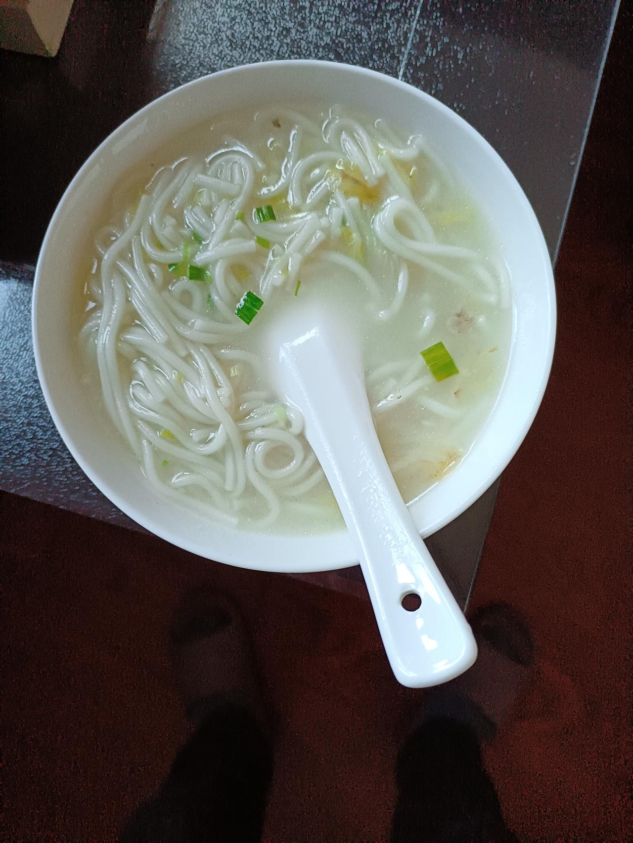 早上喝了两小饭碗骨汤烂糊面 …… 吃了一只白水蒸蛋。