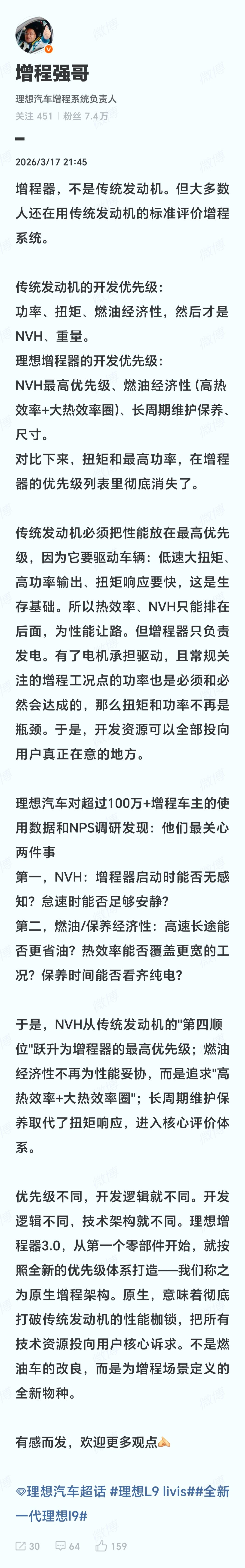 理想这位增程技术负责人很好的说服了我,什么是一台增程车需要的好的增程器。 如果要清晰表达增程器和传统发动机的设计与标定是很不一样的(这个应该教育市场),可以在新一代L9发布讲动力时,大屏就要带到“增程器本质是发电器,不是发动机”。 调查普通消费者对新一代增程器的要求确实也是NVH,保电能力,以及能不能很长时间才用保养。 大多数人其实完全分不清插混和增程,在他们看来,都是带油箱的没有里程焦虑就可以,油电混合。 今年汉兰达和赛那,据说也会推增程版。丰田这两款大车的新能源版本的市场表现值得关注。丰田动作好快,丰田资产好厚。