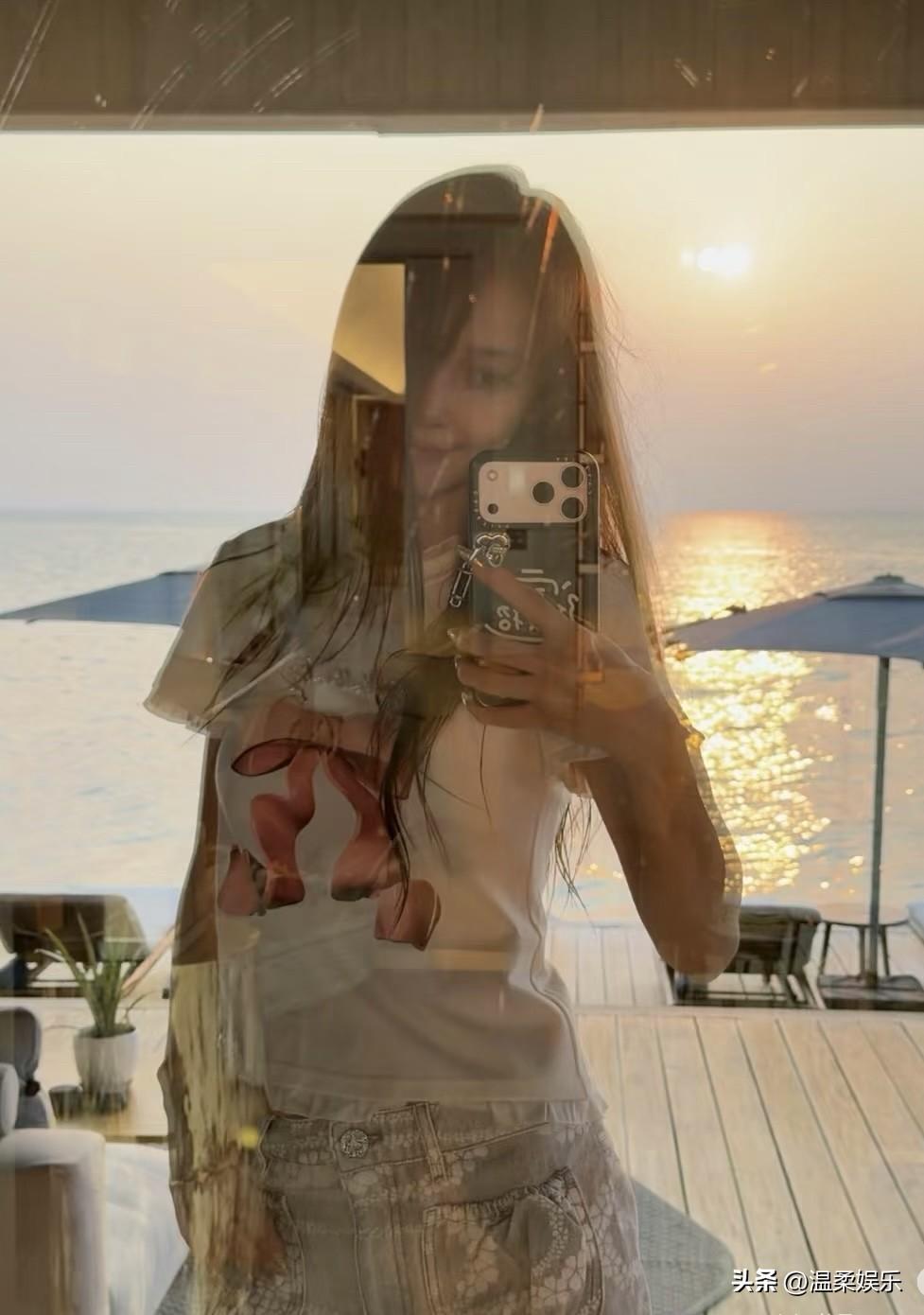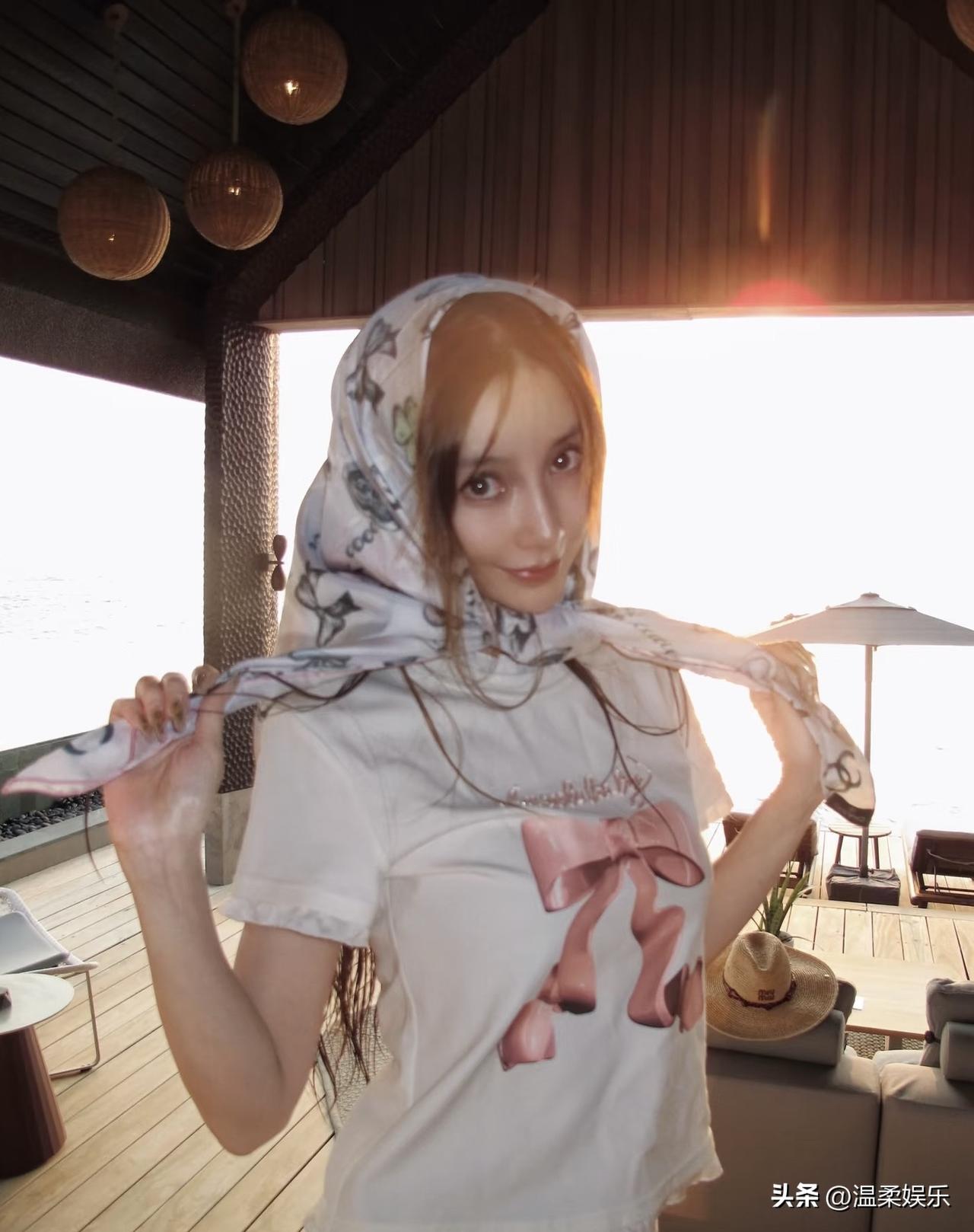 baby头裹丝巾的夕阳照🌇 成为拉飞姆首位代言人! 新鲜的旅客照来了!这是baby自拍的生活照!身穿短款粉色蝴蝶结🎀上衣,头裹丝巾,像一个俏皮😈的少女,这是又健身了吧,马甲线十分显眼,太美了!