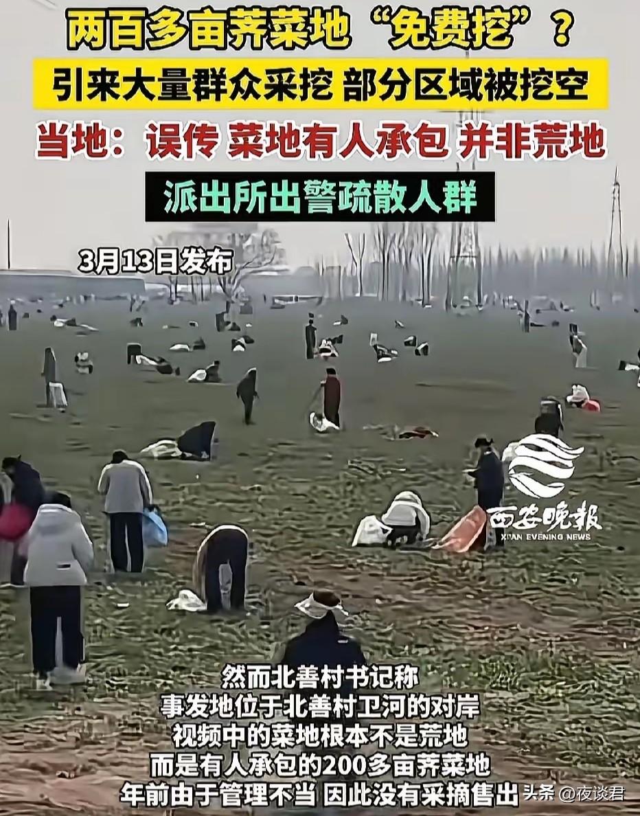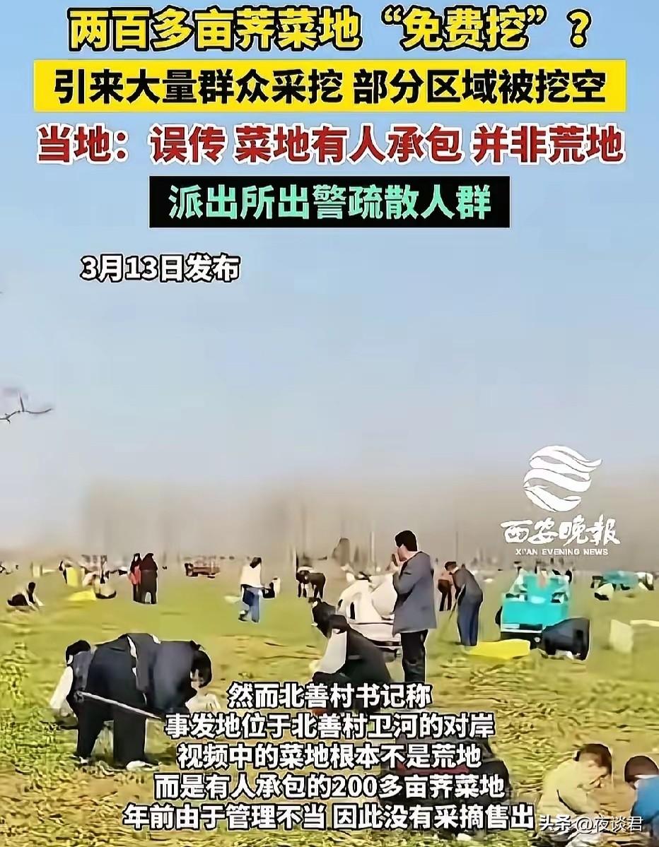 “玩大了!玩流量把自己玩进去了!”河南安阳,一女子为博流量,无视200亩荠菜地有没有主人,直接发视频宣称荠菜免费挖,吸引大批群众赶来,农户损失惨重,愤而报警,最终该女子面临调查和赔偿。 有个女子在河南河北交界的卫河边上发现了一大片荠菜,足足有200亩。 她没问这地是谁的,也没管荠菜是不是有人种的,直接就动手挖了。 挖也就算了,她还拍了视频发到网上。 视频里说荠菜是免费的,随便挖,还把具体地址给标了出来。 这条视频一发出,很快就传开了。 周边不少人看到后,都带着工具往这片地里赶。 一时间,地里挤满了人,有大爷大妈,还有全家一起来的。 大家扛着袋子、拿着工具,埋头猛挖,场面特别乱。 这些人不管荠菜大小,也不管地里的地膜和设施,只管薅。 没一会儿功夫,整片荠菜地就被挖得精光,地里也被踩得乱七八糟。 其实这片地是有主人的,是农户承包下来专门种荠菜的。 农户就指着这片荠菜卖钱,维持一家人的生计。 等农户赶到地里的时候,整个人都傻眼了。 辛苦种的荠菜没了,地里的设施也全毁了,一年的心血都白费了。 农户急着驱赶人群,可根本拦不住这么多人。 还有人觉得网上说了免费,挖了也没事,理直气壮的不肯走。 实在没办法,农户只能选择报警。 民警到现场后,反复喊话说明这是私人承包地,才把人劝散。 而最初发视频的女子,看到事情闹大了,赶紧删了视频躲起来。 她本想靠视频博眼球、涨粉丝,没想到惹出了这么大的麻烦。 警方很快就找到了这名女子,依法对她进行了调查。 她不仅要接受处罚,还得赔偿农户的全部损失。 网友热评: “谁造谣谁赔偿,造谣一张嘴,菜农心伤泪,网络不是法外之地,依法严惩造谣者!” “开始属于盗窃,主人制止后还不停止侵害,属于抢夺,警察来了也不收手,应该视为抢劫了。直播的女的应该视为教唆犯” “荠菜是承包人种的吗?荠菜半个月就老了,不锄变成杂草,地就荒了,无法种,长不了粮食。如果是野生的,这个承包人,心太黑了,挖了一个大坑,让你们跳。” “那些后来的人真的不知道这是有主的菜吗?他们知道,不过是因为摘的人太多了,觉得自己就摘一点无所谓,反正法不责众,这就是人性。最后也证明了这点,警察来了也只不过是驱离了摘菜的人,没有赔偿,没有处罚,连菜都被带走了。” “菜农应该谢谢这个女人,菜还没种好,就找好销路了,未必能赚多少,但绝对赔不了,这算不算另类的旱涝保收。” 一点看法: 好好的一件事,闹成这样,谁都没捞到好处。 农户损失惨重,女子也为自己的行为付出了代价。 其实想想,这事本来完全可以避免。 女子拍视频前,多问一句归属,就不会有后续的麻烦。 那些跟风去挖荠菜的人,也该多留个心眼。 不是网上说免费,就真的能随便拿别人的东西。 农户种地不容易,从播种到收获,要付出很多心血。 每一份劳动成果,都值得被尊重,不能随意糟蹋。 网络时代,大家都喜欢拍视频分享日常。 但分享的前提,是守规矩、讲道德,不能罔顾事实瞎宣传。 为了一点流量,损害别人的利益,触碰法律的红线,真的不值当。 做人做事,都得有底线,懂得换位思考,才能少犯错误。 不管什么时候,都要明白,不属于自己的东西不能拿。 尊重他人,也是在尊重自己,别为了一时的利益,丢了做人的本分。