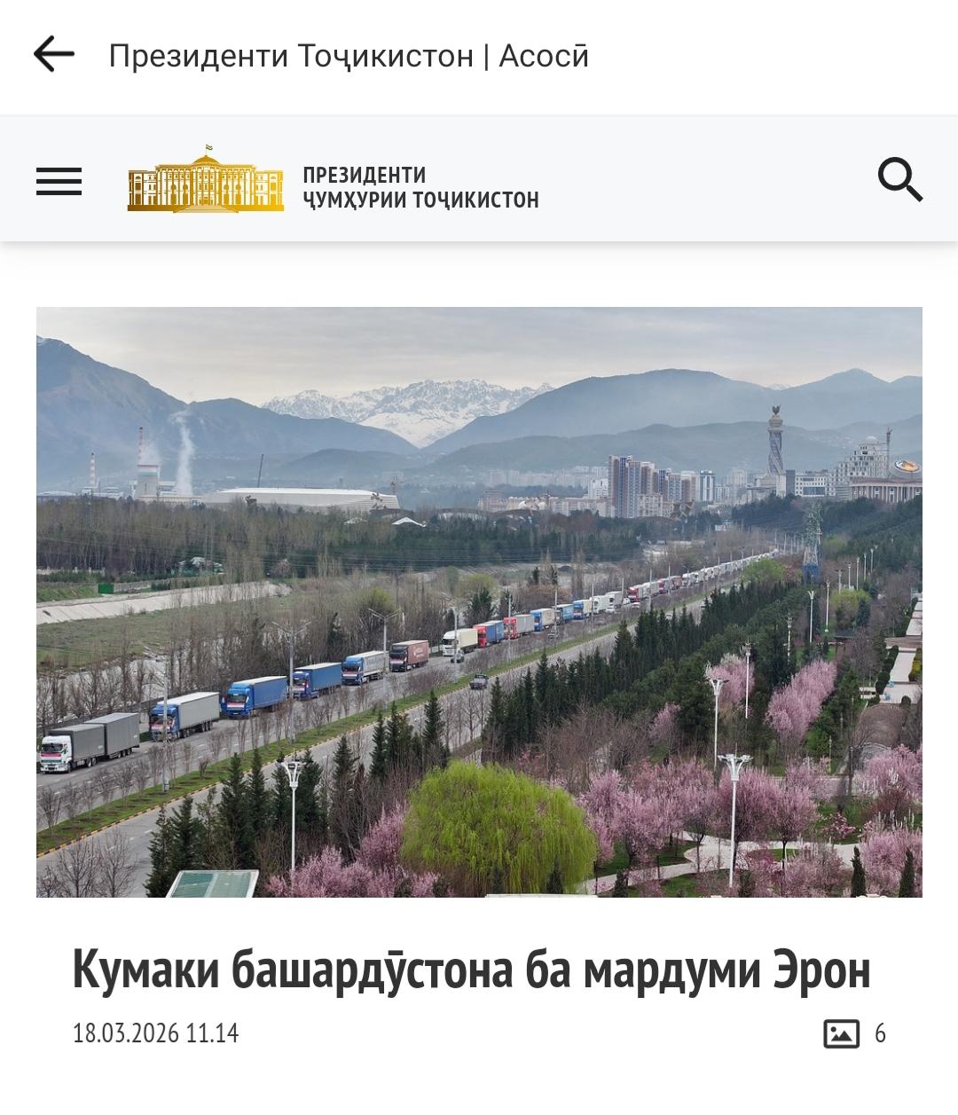 拉赫蒙总统亲自发文 总统府官网官宣确认 110辆大卡组成的塔吉克斯坦人道主义援助车队 于18日前往伊朗 这110 辆大型卡车组成车队,负责运送 3610 吨 人道主义物资 包括 45 吨药品、大量卫生用品、儿童衣物、食品、家居用品、帐篷、建筑材料等急需物 只是,塔吉克斯坦到伊朗,长路漫漫 援助车队需途经阿富汗等地区,漫长的路途中, 难免有敌对势力蠢蠢欲动, 想方设法渗透、破坏,甚至企图对物资进行“掉包” 真心期盼能借助高科技手段全程护航。 让这批物资顺利抵境,到达伊朗人民手中 Source: X