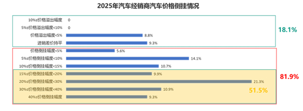 价格战失控成为致命导火索,81.9%经销商遭遇价格倒挂,超半数倒挂幅度超15%,新车毛利直接跌至-25.5%,卖一台亏一台已成常态。