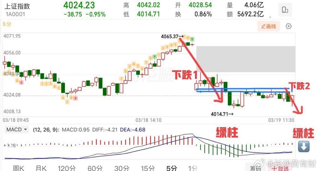 黑周四,利空来袭,后续怎么走? 受外围局势影响,整个金融市场又震动了一下,上证指数顺势大幅低开后弱势震荡,盘面上基本上也没看到什么承接力,成交量小幅放大,但远远不够,基本上没什么太大变化,这里大盘要想止跌,要么下杀放大量出来,直接杀恐慌盘,要么缩量到极致,否则还会一直处于这种不温不火的状态。 技术面看,从指数的角度看,还未出现止跌讯号,早盘最低点4014也未必是短期低点,只要没看到有力度的反弹,基本上还有再下破的可能,这个是不排除的,但不用怕不加速大概率会有回拉。 从分时走势看,如图1,昨天给大家讲过,什么时候容易形成反弹,对比每一个下跌段的力度,只有当下跌力度不断减弱才有可能形成比较有力度的反弹,就从4197开始看起,比较前后力度,观察下方macd绿柱,能够发现什么问题?是不是下跌力度在逐步减弱的一个过程,绿柱面积在不断减小,说明往下的空头动能也在削弱。所以为什么说,这个位置不能走加速向下,走加速就意味着空头力量还在放大。明白了嘛? 另外,如图2,还可以单独看第四段从3065开始的下跌段,看看它的内部也有结构,也可以这么去对比看。 大的结构,如图3,当前还处于大的中枢箱体,4002是关键支撑,这个位置是多方的防守位,葱分时走势上看,下午大概率会有回拉。 个人观点,仅供参考!