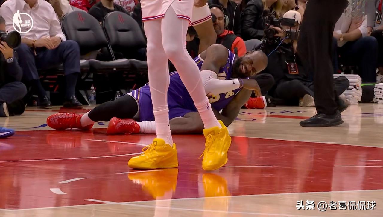 湖人超级球星詹姆斯真是太会装可怜了!在今天湖人客场挑战火箭的比赛中,当时比赛进行到了第四节的五分多钟,詹姆斯在一次快攻反击中惨遭火箭新星小史密斯的犯规,詹姆斯在倒地的时候磕到了手肘,这下可把詹姆斯给疼坏了,只见詹姆斯躺在地上疼得呲牙咧嘴、死去活来,仿佛受了大伤一样。 说实话,詹姆斯这属于典型的装可怜,因为小史密斯在犯规的时候对詹姆斯有一个保护动作,因此詹姆斯的痛苦完全是演出来的。
