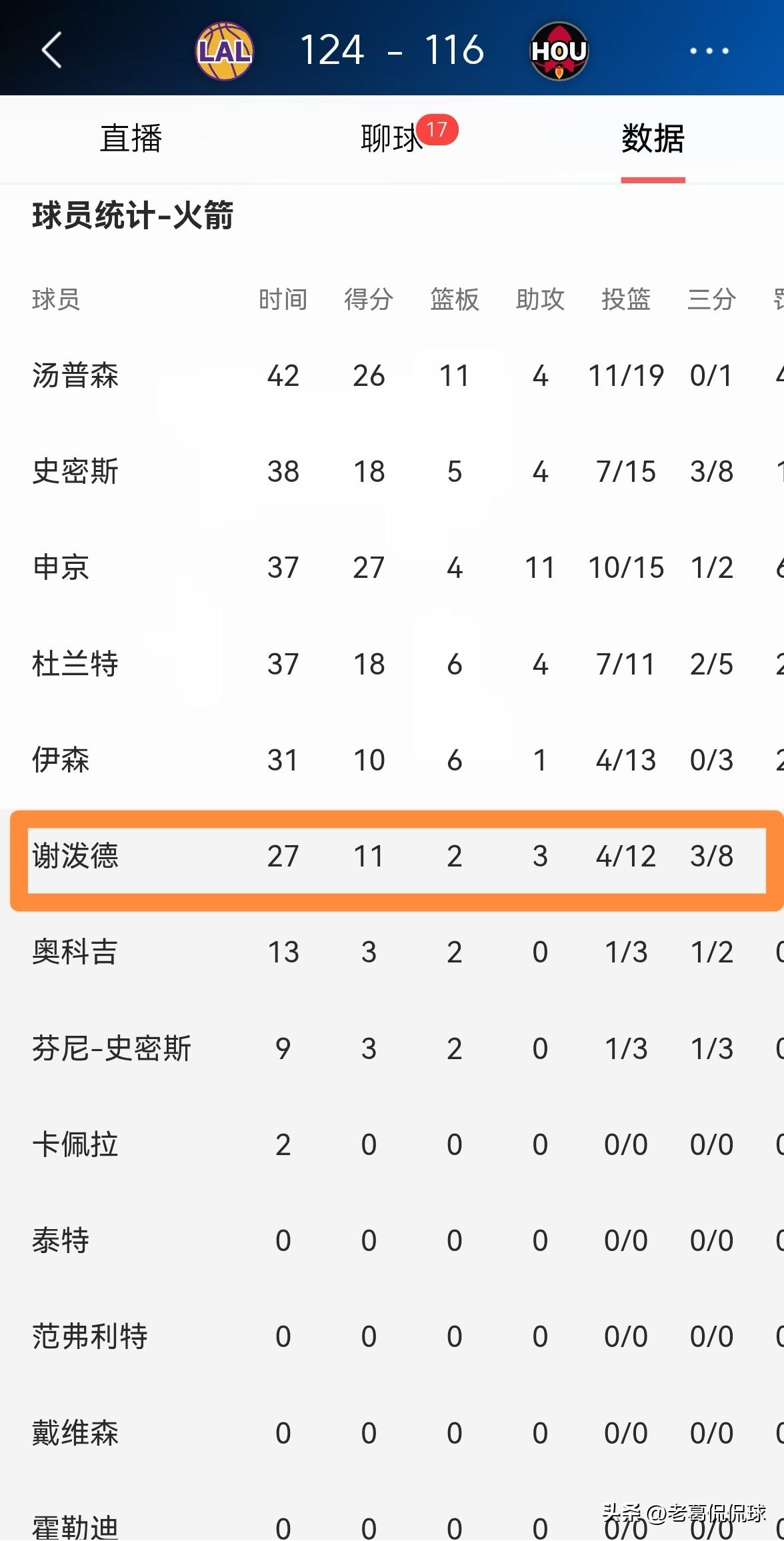 火箭新星谢波德真不配在关键时刻上场!在今天火箭主场以116:124输给湖人的比赛中,谢波德再次打出了非常低效的表现,他在替补出战的27分钟里,投篮12中4,其中三分球8中3非常低效的得到11分,还有3次失误和3次犯规,他的场上正负值为-8。 值得一提的是,在第四节比赛的关键时刻,谢波德临危受命被主帅乌度卡替换上场,然而谢波德在上场以后打出了灾难性的表现,他在攻防两端都表现糟糕,白白的浪费了上场机会。