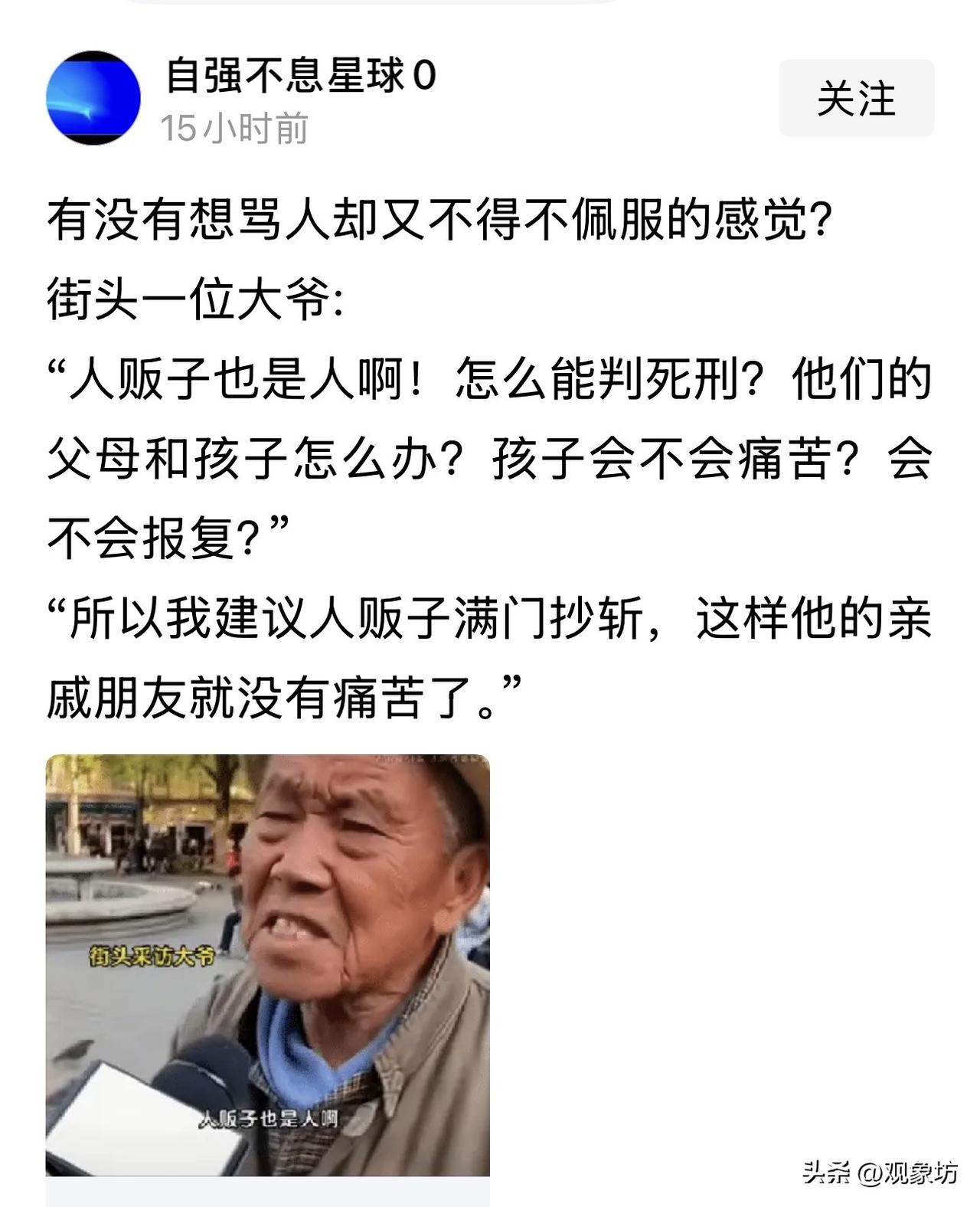 “人贩子也是人?”大爷一句神回复,撕开了伪善的遮羞布:既然心疼他们全家,不如直接满门抄斩! 最近,网上又掀起了关于“拐卖儿童是否该一律判死刑”的激烈争论。 在这个节骨眼上,一位大爷的言论火了,火得让人背脊发凉,却又忍不住想拍手称快。 面对记者采访,大爷一脸慈悲地反问:“人贩子也是人啊!怎么能判死刑?他们的父母和孩子怎么办?孩子会不会痛苦?会不会报复社会?” 听到这儿,不少人的血压可能已经上来了。但别急,大爷话锋一转,语出惊人:“所以我建议,对人贩子直接满门抄斩!这样他的亲戚朋友就没有痛苦了,一了百了!” 初听是荒诞,细品是极致的讽刺;再深思,这哪里是疯话,分明是对那些披着“人权”外衣、行“纵恶”之实的伪理性最犀利的耳光! 一、当“圣母心”泛滥时,谁还记得被拐孩子的血泪? 这位大爷的前半段话,像极了某些所谓的“法律专家”和“理性中立派”的陈词滥调。 他们总是高举“人道主义”的大旗,痛心疾首地呼吁:“要慎用死刑”、“要给罪犯改过自新的机会”、“人贩子也有家人,杀了他,他的孩子多可怜。” 可笑!可恨! 当人贩子伸出魔爪,将一个活生生的孩子从父母怀中强行夺走时,他们想过那个孩子的父母也是人吗? 当被拐儿童在黑暗的地下室里哭喊求救,当寻子父母二十年来走遍千山万水、哭干眼泪、甚至精神崩溃走向“社会性死亡”时,这些“理性派”在哪里? 他们选择性失明,只看到了罪犯的“人权”,却对受害者的“地狱”视而不见。 正如北大车浩老师所言,法律的差异量刑是为了给被拐孩子留出生还的希望,避免人贩子因“反正都是死”而杀人灭口。这是基于司法技术的理性考量,但这绝不是对人贩子及其家属的无底线同情! 把“罪责自负”扭曲成“关爱罪犯全家”,这不仅不是仁慈,这是对善良最大的亵渎。 二、大爷的“满门抄斩”,是一记响亮的逻辑耳光 大爷的后半句建议——“满门抄斩”,看似疯狂,实则是用归谬法将那些虚伪的逻辑推向了极致。 既然你们觉得“杀了人贩子,他的家人会痛苦”,那好,为了彻底消除这种“痛苦”,我们把源头切断,让他的亲戚朋友也跟着一起消失,这样不就“没有痛苦”了吗? 这是一个多么荒谬却又无比精准的逻辑闭环! 它赤裸裸地揭示了那种“过度共情罪犯”观点的荒唐本质: 如果因为担心罪犯家属痛苦就不敢严惩罪犯,那是不是以后杀人犯也不用判死刑,因为怕他老婆守寡?抢劫犯也不用坐牢,因为怕他老母无人赡养? 法律的红线,从来不是建立在罪犯家属的眼泪之上,而是建立在受害者破碎的家庭之上! 大爷用一句戏谑的“满门抄斩”,狠狠打碎了那些试图用“温情脉脉”来稀释罪恶的幻想。他在告诉所有人:别跟我扯那些虚头巴脑的“人性关怀”,在滔天大罪面前,任何对恶魔的怜悯,都是对天使的残忍! 三、严惩不是为了泄愤,而是为了守住最后的底线 当然,我们深知,现代法治文明讲究“罪责自负”,绝不会真的搞什么“连坐”或“满门抄斩”。大爷的话,是一种情绪的表达,更是对现状的焦虑。 但这种焦虑背后,有着坚实的现实支撑。 看看那些被拐家庭吧。孙海洋找了儿子 14 年,郭刚堂找了儿子 24 年。多少个家庭因为一个孩子被拐,从此陷入无尽的黑暗?父亲酗酒消沉,母亲精神失常,原本幸福的家支离破碎。 人贩子偷走的不仅仅是一个孩子,他们是谋杀了一个家庭的未来,是凌迟了父母余生的每一寸光阴! 在这种深如大海的苦难面前,如果我们还纠结于“人贩子的孩子会不会心理阴影”,那才是真正的人性沦丧。 正如近期余华英案判决所引发的共鸣:少杀慎杀不是“不杀”。 对于像余华英这样拐卖多名儿童、造成无数家庭家破人亡的极恶之人,死刑不仅是法律的制裁,更是全社会正义共识的体现,是给天下父母的一剂定心丸。 四、结语:别让“理中客”寒了寻亲父母的心 这位大爷的“神回复”,之所以能刷屏,是因为他说出了无数普通人不敢说、不愿说的心里话。 我们支持法治的进步,支持科学的量刑,支持通过差异化刑罚来保护被拐儿童的生命安全(如前所述,避免人贩子狗急跳墙)。但是,这一切的前提,必须是站在保护受害者、严惩犯罪者的立场上。 任何脱离了这一前提,转而为人贩子及其家属唱赞歌的“高论”,都是在耍流氓。 人贩子也是人?没错,但他们首先是泯灭人性的罪犯! 他们的孩子无辜?是的,但请别忘了,被拐的孩子更无辜! 如果法律不能为受害者撑起一片天,如果舆论还在为施暴者寻找借口,那才是这个社会最大的悲哀。 大爷的“满门抄斩”虽是气话,却是一面镜子。它照出了伪善者的嘴脸,也照出了老百姓心中最朴素的正义观: 对待吃人的魔鬼,最好的慈悲,就是磨亮手中的刀! 愿天下无拐,愿每一个孩子都能平安回家,愿所有的“理中客”在张嘴之前,先去看看那些寻亲父母绝望的眼神。