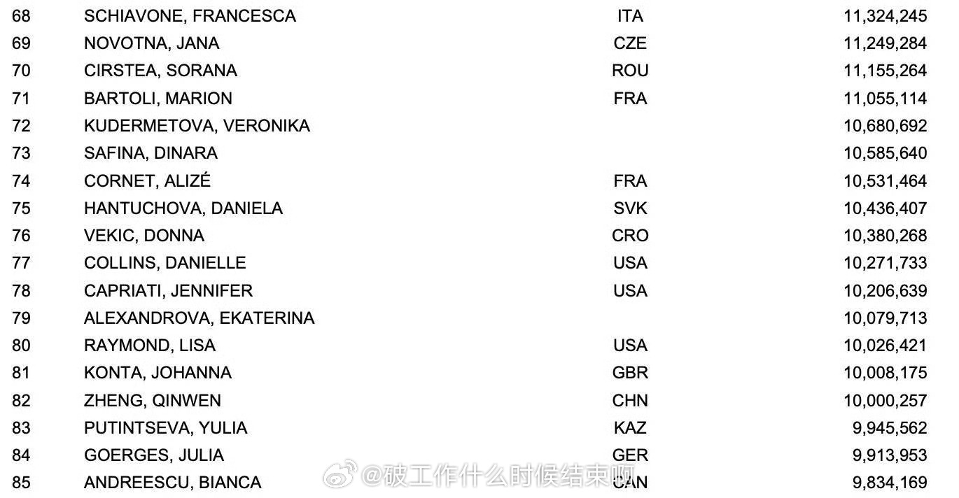 WTA更新生涯总奖金榜,郑钦文凭借IW赛事奖金突破1000万美元,成为中国网协第三位达此成就的选手。