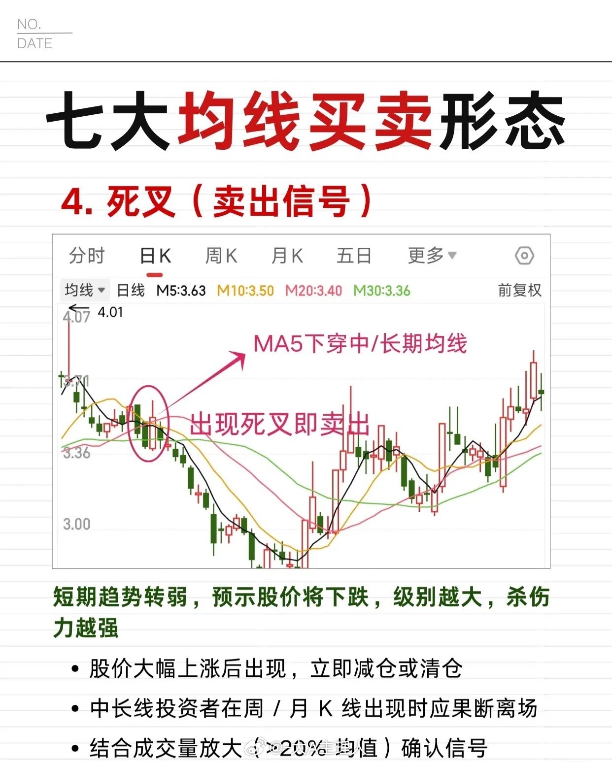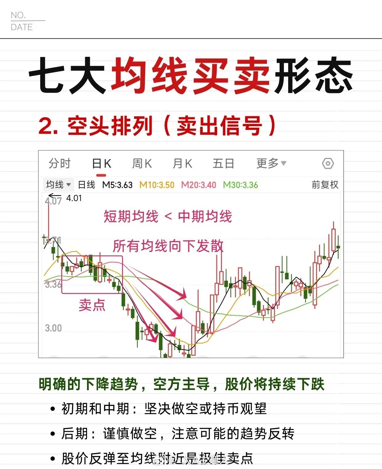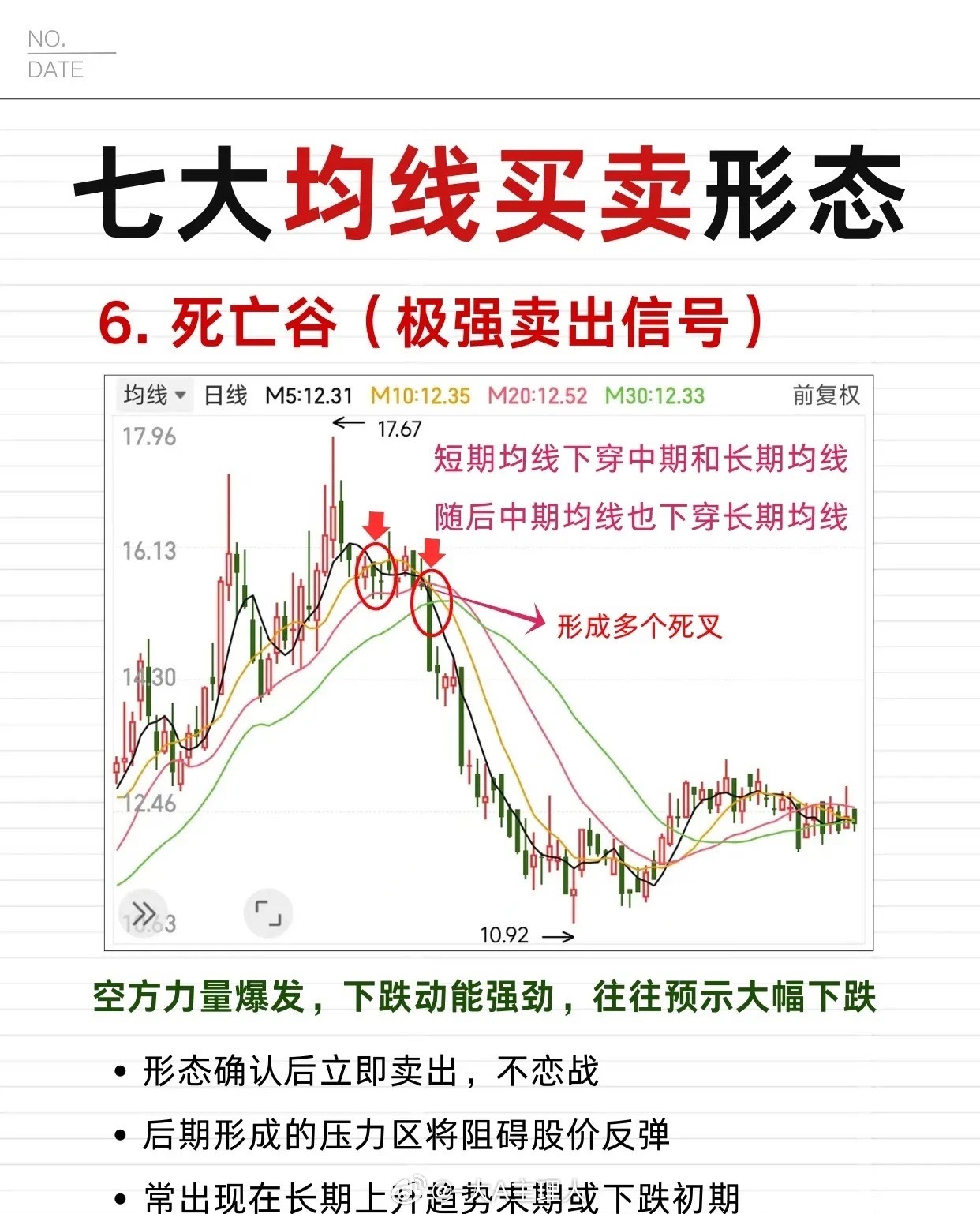 1. 空头排列:短期均线<中期均线,所有均线向下发散,呈明确下降趋势(空方主导)。初期/中期坚决做空或持币观望,后期谨慎做空(防趋势反转);股价反弹至均线附近是极佳卖点,预示股价持续下跌。2. 死叉:MA5下穿中/长期均线,短期趋势转弱。级别越大杀伤力越强,股价大幅上涨后出现需立即减仓/清仓,中长线投资者周/月K线出现时果断离场,结合成交量放大(>20%均值)确认信号,预示股价将下跌。3. 断头铡刀:高位盘整后期,一根大阴线一次性跌破多条均线,多方防线崩溃、空方强势出击。形态出现当天收盘前必须卖出,后期股价难涨至阴线实体范围内,若放量>2倍均值,跌幅或达30%以上,预示股价快速下跌。4. 死亡谷:短期均线下穿中期、长期均线,随后中期均线也下穿长期均线(形成多个死叉),空方力量爆发、下跌动能强劲。形态确认后立即卖出(不恋战),后期形成的压力区阻碍股价反弹,常出现在长期上升趋势末期或下跌初期,预示大幅下跌。