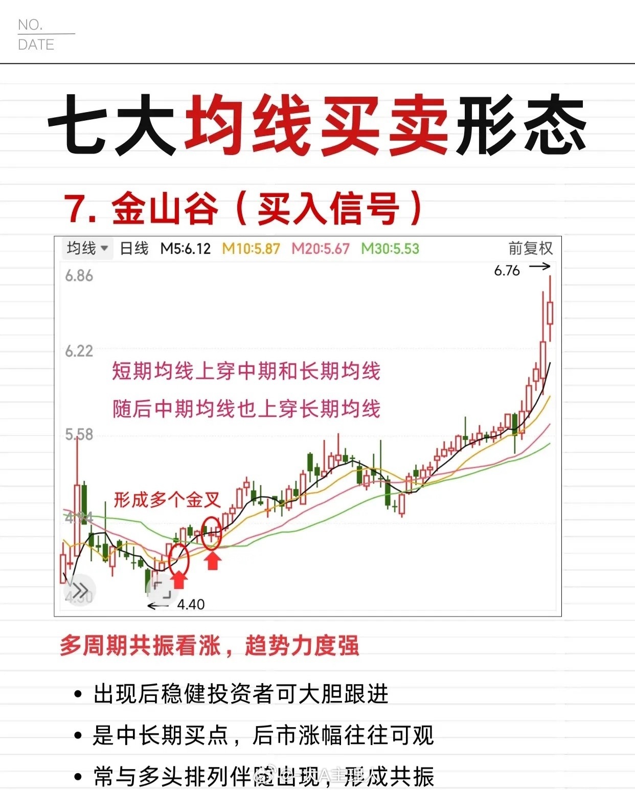 1. 多头排列:短期均线>中期均线,所有均线向上发散,呈明确上升趋势(多方主导)。初期/中期积极做多、可加仓,后期谨慎持股;股价回调至均线附近是买点,预示股价持续上涨。2. 金叉:MA5上穿中/长期均线,短期趋势转强。级别越大上涨力度越强,初期/中期积极做多、可加仓,后期谨慎持股;股价回调至均线附近是买点,预示股价将上涨。3. 金山谷:短期均线上穿中期、长期均线,随后中期均线也上穿长期均线(形成多个金叉),多周期共振看涨、趋势力度强。是中长期买点,后市涨幅可观,常与多头排列共振,稳健投资者可大胆跟进。