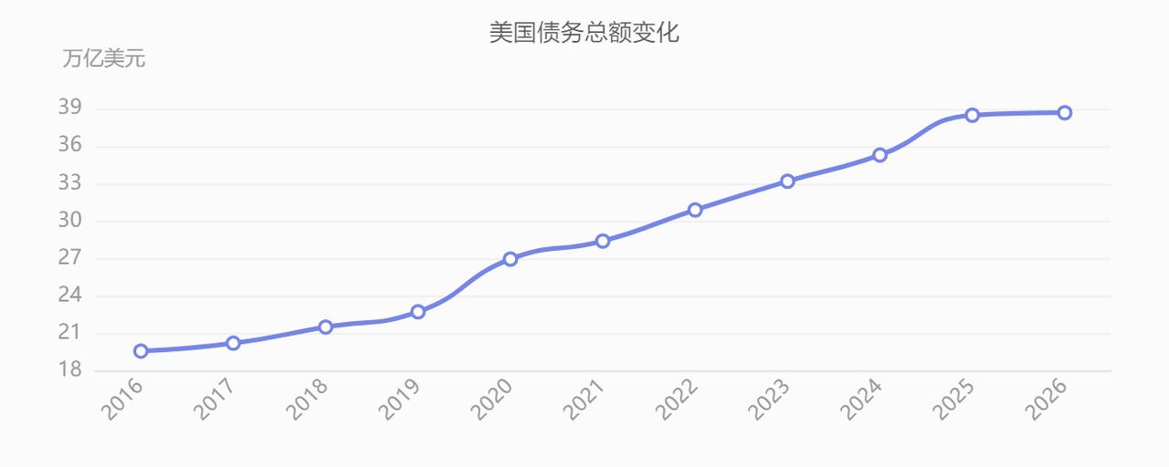 美国债务突破39万亿美元。官方数据显示,十年内债务翻了一番——从2016年的19.5万亿美元增至如今的39万亿美元。现在每146天新增1万亿美元,相当于每天新增72.3亿美元。 回顾历史数据,美国债务增长呈现明显的加速趋势: 2016年:债务约19.6万亿美元 2020年:激增至27.0万亿美元 2024年:达到35.3万亿美元 2026年3月:突破39万亿美元