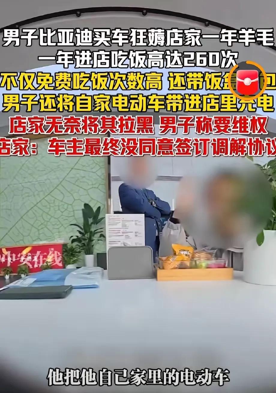 羊毛差点被薅秃!浙江,男子买了辆比亚迪轿车,不料,却成了4s店销售们的眼中钉。他自从买车后,就把4s店当成了娘家,一年在店里免费吃了260顿饭,吃完还打包带走。这还不算,只要他想洗车,就开到店里来免费洗,更气人的是,他不光来免费给自己的汽车充电,还把自家的电动车藏到后备箱,拉到店里充电。把销售们气的差点跳起来,报了10次警都没能解决,只好把男子拉黑。 这事在当地4S店圈子里传得沸沸扬扬,连隔壁品牌的销售都跑来看热闹。大家都知道,现在汽车4S店为了留住老客户、吸引新客源,都会提供一些免费配套服务——比如保养时的简餐、日常洗车优惠、车主专属充电区,这些本来是提升服务体验、拉近距离的暖心举措,没想到在这位庞先生眼里,直接变成了“长期免费福利”。 一年365天,他有260天都在店里吃饭,算下来几乎是工作日天天报到,有时候还带着家人一起来,吃完顺手用饭盒把剩菜打包,说是“带回家给家里人尝尝”。洗车更是随叫随到,不管车脏不脏,只要路过就开进去洗,连店里的保洁阿姨都认得他的车牌。最让店员崩溃的是,他还把自家的小电动车拆了塞进后备箱,拉到店里员工专属的充电区免费蹭电,理由是“我是你们的车主,用店里的电天经地义”。 4S店的工作人员一开始还耐着性子沟通,提醒他这些服务是为了方便车主保养、看车时使用,不是长期生活保障。可庞先生振振有词,说“买车的时候你们没说不能天天来吃饭、充电,现在凭什么限制我”,甚至拿出购车合同和服务条款逐条抠字眼,说店里没有明确禁止“高频次使用免费服务”。双方闹得不可开交,店里前前后后报了10次警,民警来了也只能调解,毕竟从法律上很难界定这种“过度薅羊毛”的行为属于违规。 最后实在没办法,店里只好把他的手机号、微信全部拉黑,禁止他再进入门店。这下庞先生不干了,拍着桌子说要维权,说4S店“歧视老客户、单方面违约”,甚至放话要找媒体曝光、走法律途径。可当店里提出坐下来签调解协议,约定合理的服务使用频次时,他又坚决不同意,咬死了“我就要享受全部免费服务”。 其实这事说白了,就是边界感的问题。4S店的免费服务本质是商业馈赠,不是无限供应的“大锅饭”,就像邻居给你递了块糖,你不能天天上门要一整袋。庞先生把商家的善意当成了理所应当,把公共服务资源当成了私人福利,看似占了小便宜,实则丢了体面。 反过来想,4S店也有值得反思的地方——当初推出免费服务时,没有明确约定使用频次和范围,才给了这种“钻空子”的机会。如果能提前把规则说清楚,比如“免费餐食仅限保养/看车期间使用”“充电区仅限本店车辆”,也不至于闹到这么难看。 各位读者你们怎么看?欢迎在评论区讨论。