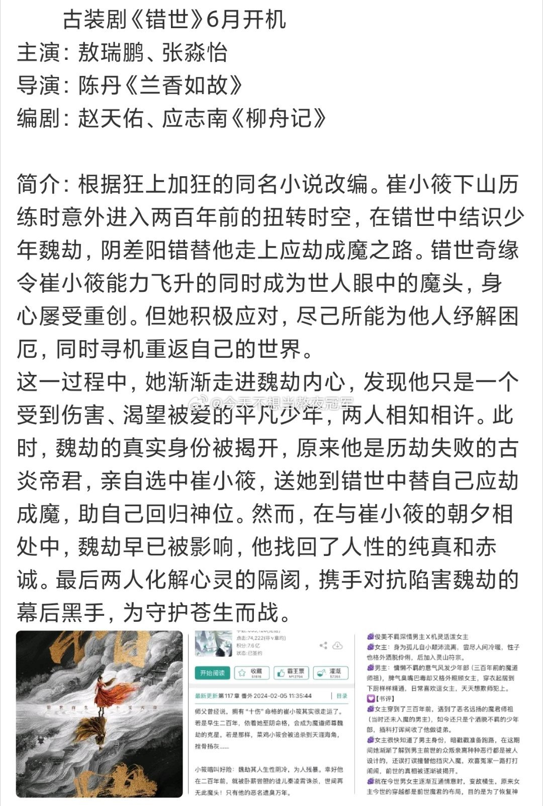 🍉🍉鹅仙侠《错世》男主从常华森传到敖瑞鹏这里了,女主张淼怡。导演原定郭虎,现在换为陈丹(《兰香如故》)