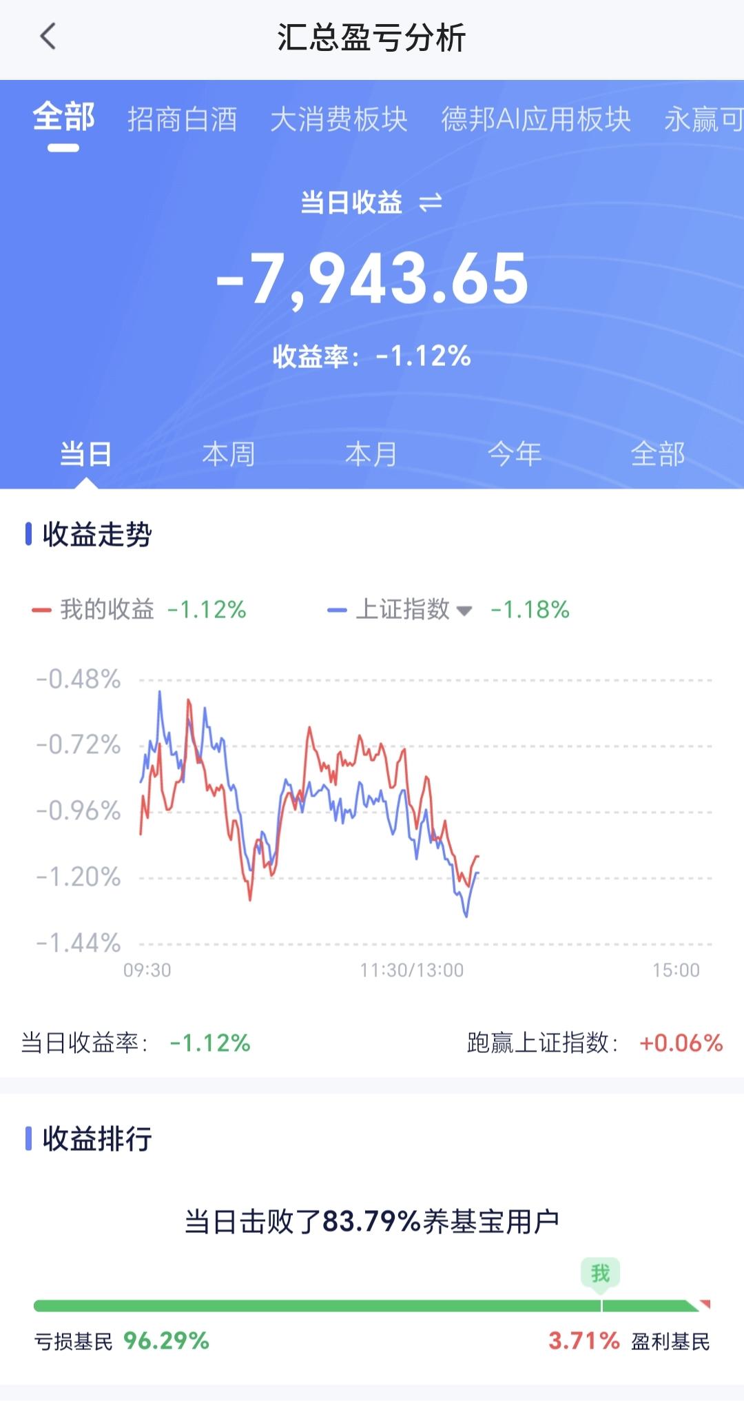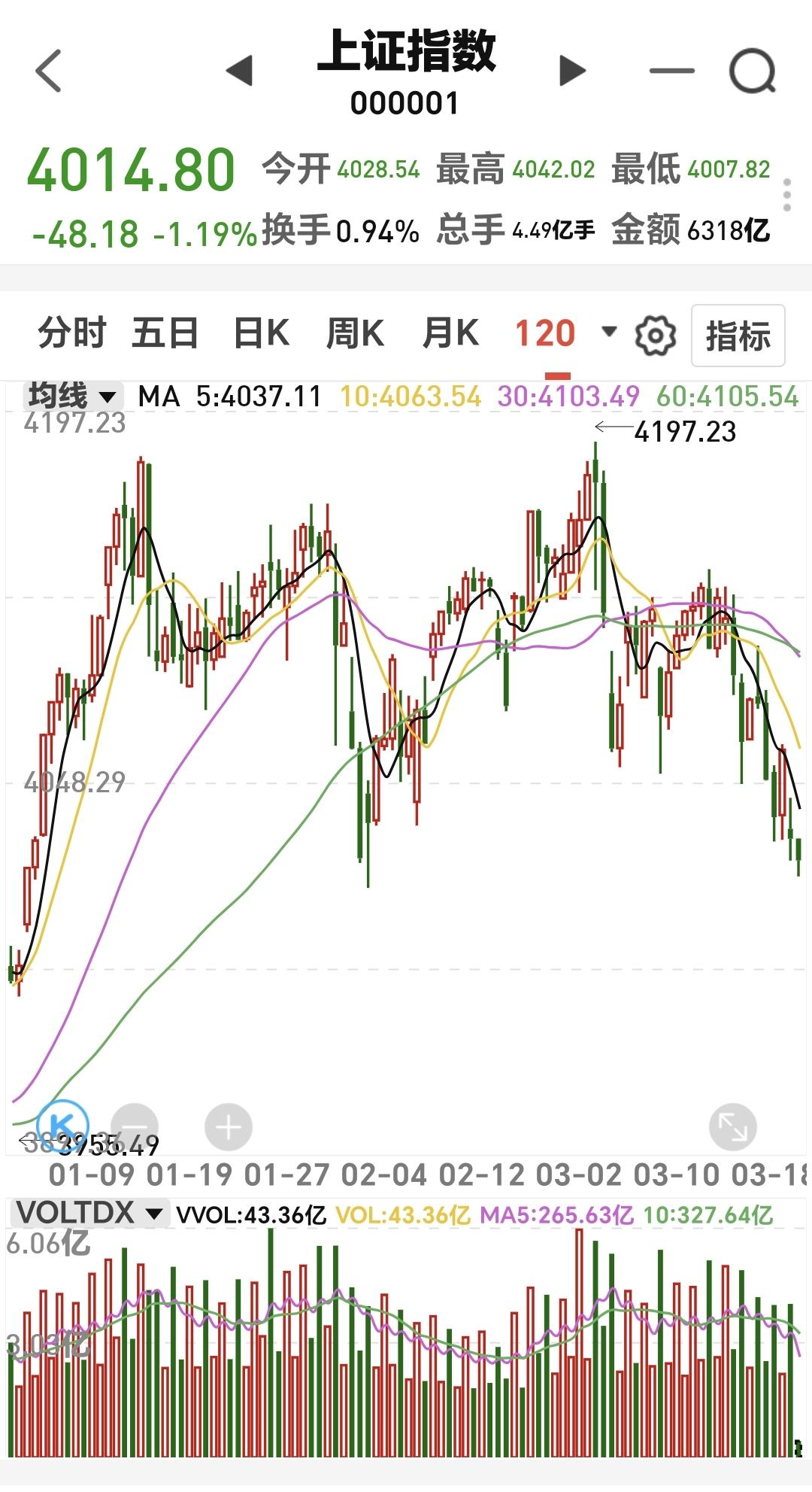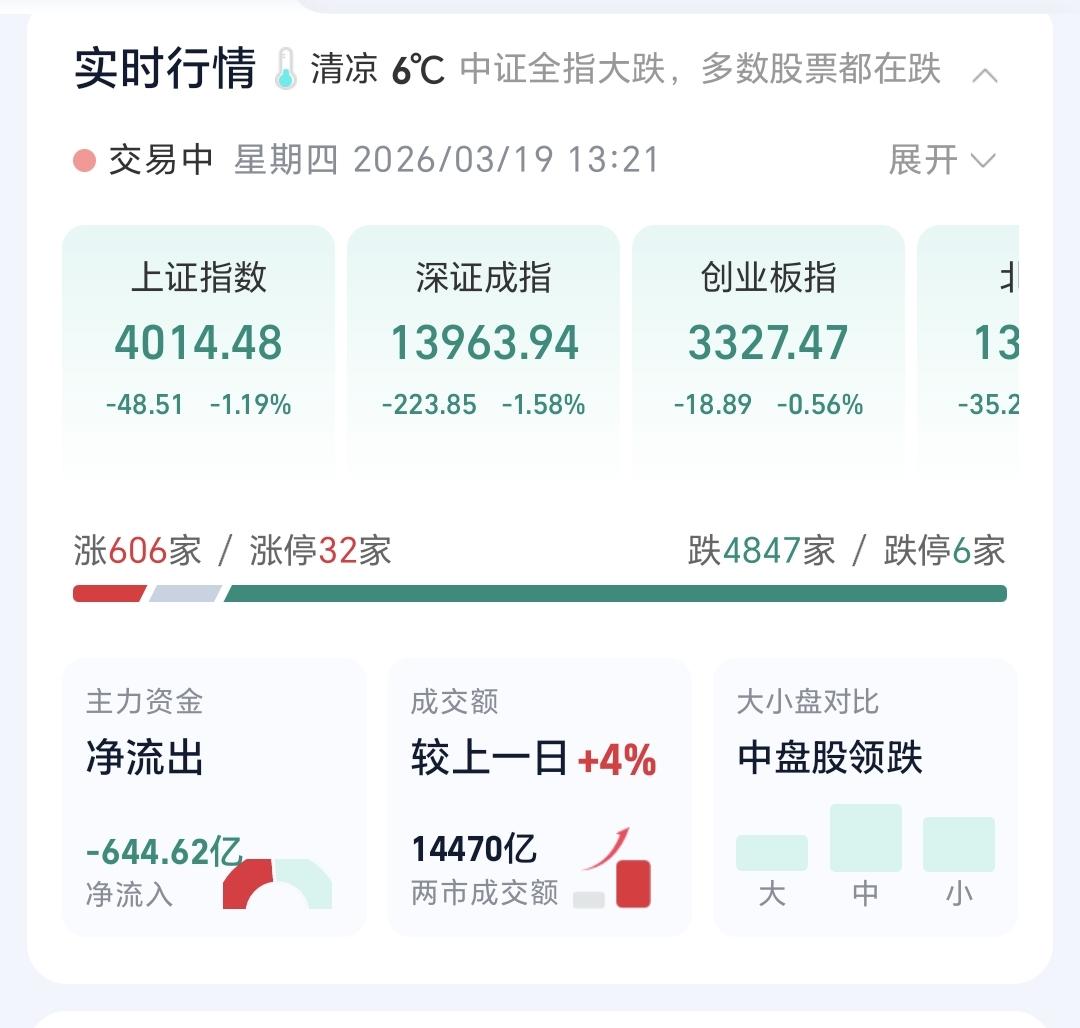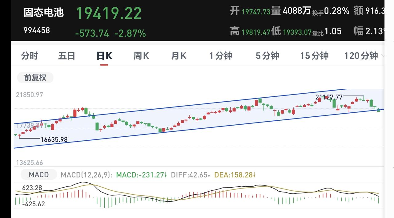 基金:市场会不会跌破4000点 今天市场低开以后,震荡的幅度并不是很大,现在三大指数都是下跌,创业板指下跌了0.53%,盘中点位3328点,上证指数下跌了1.17%,盘中点位4015点。 整个股票市场,上涨606家,下跌4847家,涨停32家,跌停6家,上涨家数少于下跌家数。 持有的基金中,盘中估值盈利的只有海外互联网板块,估值亏损金额最大的三个板块是:证券板块,芯片半导体板块,白酒板块,估值整体亏损了7943元。 整个基金市场,上涨5145家,下跌14526家,没有上涨幅度超过5%的基金,下跌幅度超过5%的96家。 图10是今天板块的上涨排行榜,上涨幅度最大的三个板块是:煤炭板块,电力板块,可转债板块,图11是今天板块的下跌排行榜,下跌幅度最大的三个板块是:有色金属板块,稀土永磁板块,黄金股板块,图12是今天基金的加仓和减仓人数,加仓6359431人,减仓3729426人,加仓人数超过了减仓人数。 整个市场主力资金净流入最多的三个板块是:公用事业板块,光伏板块,电力板块,主力资金净流出最多的三个板块是:蓝筹策略板块,国企板块,高端制造板块。 1:今天黄色线在蓝色线下方,但两条线之间的敞口并不是非常大,这是今天不会大幅度下跌的主要原因,继续观察两条线的位置会不会有变化。 2:现在两市累计成交14470亿,相比于昨天同期放量了4%,主力资金净流出644亿,这样的情况之下,今天大幅度下跌的可能性也不大。 3:现在五天线位置是4061点,盘中点位4014点,是在五天线之下的震荡,如果收盘之前有反弹,需要观察反弹的力度,不能站上五天线的反弹都不能算为强反弹。 4:固态电池板块现在盘中估值下跌了2.82%,持有人数在所有板块当中排名第36位。 固态电池板块今天下跌,已经跌破了日线级别上涨通道的下轨线。近期观察这个破位是不是有效破位,如果是有效破位了日线级别上涨通道的下轨线,短线持有的人需要注意风险。 固态电池板块周线级别处于上涨通道中,今天的下跌已经来到了周线级别上涨通道下轨线附近。近期观察会不会跌破这个周线级别上涨通道的下轨线,如果实现了有效破位,长线持有的人也需要注意风险。 5:光伏板块星期二的时候就已经下跌跌破了日线级别上涨通道的下轨线,昨天和今天都是在这个上涨通道的下方震荡,基本上已经确定为有效破位,短线持有的人需要注意风险。 光伏板块周线级别处于上涨通道中,由于最近一段时间的下跌,已经来到了这个上涨通道下轨线附近。近期观察会不会有效破位这个上涨通道的下轨线,如果实现了有效破位,长线持有的人也需要注意风险。 6:商业航天板块日线级别处于短期下跌通道中,今天的下跌已经来到了下跌通道下轨线附近。近期观察会不会跌破这个下跌通道的下轨线,然后进行加速下跌。想进场的人需要耐心等待上涨突破这个下跌通道上轨线的时候,再考虑要不要进场。 商业航天板块周线级别处于上涨趋势中,距离上涨通道的下轨线还有一段空间。近期观察会不会快速下跌跌破这个周线级别上涨通道的下轨线,如果有效破位这个周线级别上涨通道的下轨线,长线持有的人也需要注意风险,周线级别的截图见下面的评论区。 到现在为止的判断,调整震荡还处于构成当中,4000点破位是早晚的事情,今天究竟应该怎么办?我会在评论区留言。 花1秒钟点赞,花30秒钟评论,就是对我最大的支持,谢谢大家的支持。