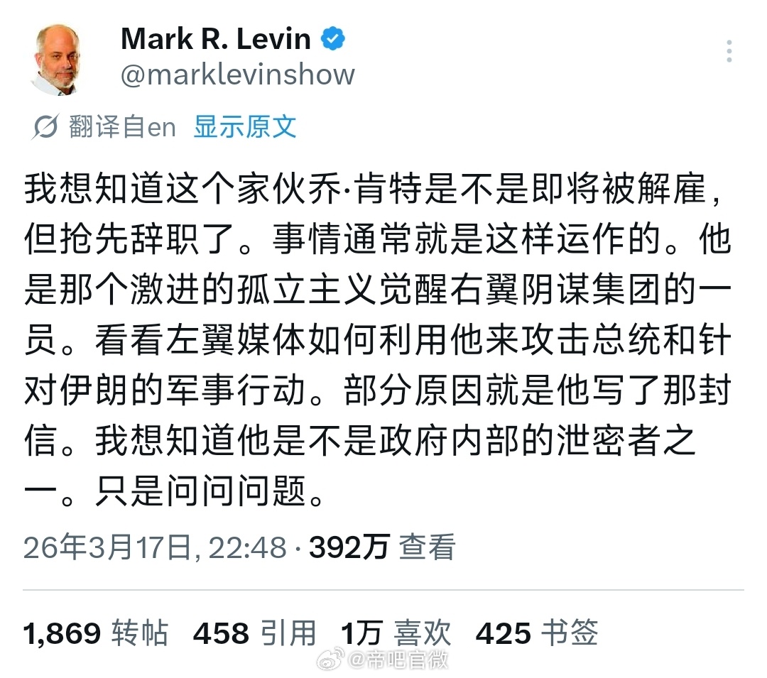 MAGA 阵营要因为伊朗问题大分裂了。美国保守派媒体人马克·莱文公开批评了因反对袭击伊朗而辞去美国国家反恐中心主任职务的乔·肯特,称他是个背叛总统的泄密者。随后洛伦·卡尔普(前警长、共和党人,曾竞选华盛顿州州长,MAGA 草根政治人物)发文猛烈回击莱文,称他只会坐在空调办公室里瞎逼逼。这些都是资深老MAGA了,没想到内讧成这样,现在美国国债突破39万亿美元了,很多美国人都在疑问:跟伊朗发生冲突到底能给美国带去什么好处。