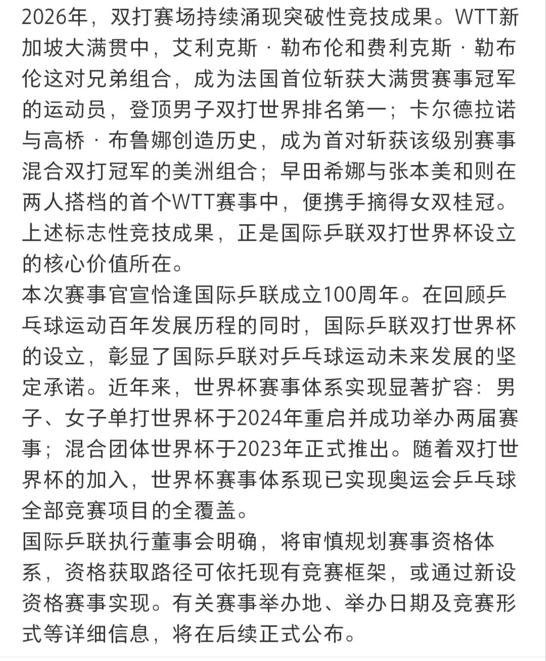 国际乒联双打世界杯将于2027年举办,目前赛事举办地,举办日期,竞赛形式均一无所知。 都不用去看日历,就知道赛事安排紧密的多么令人窒息。 以后乒乓球会不会像羽毛球一样,单打专注于单打,双打则专注于双打。这样即便赛事频繁一些,运动员不需要兼项因此也不会过于疲惫。 当然前提是要先把双打的奖金提上来,就当下来说,这点奖金可怜的不是一星半点。 随着赛事的改革,国乒想要包揽冠军越来越难了!