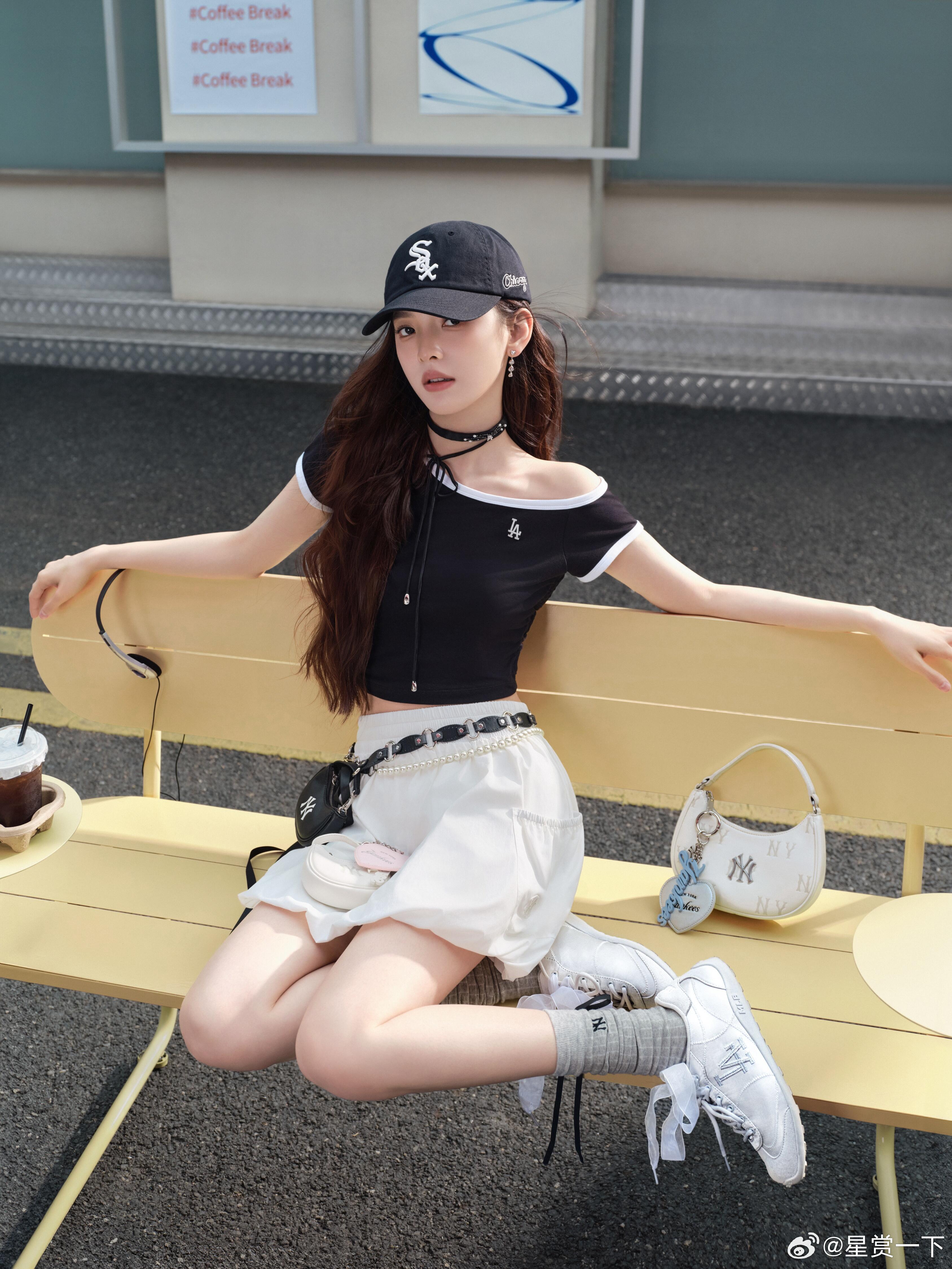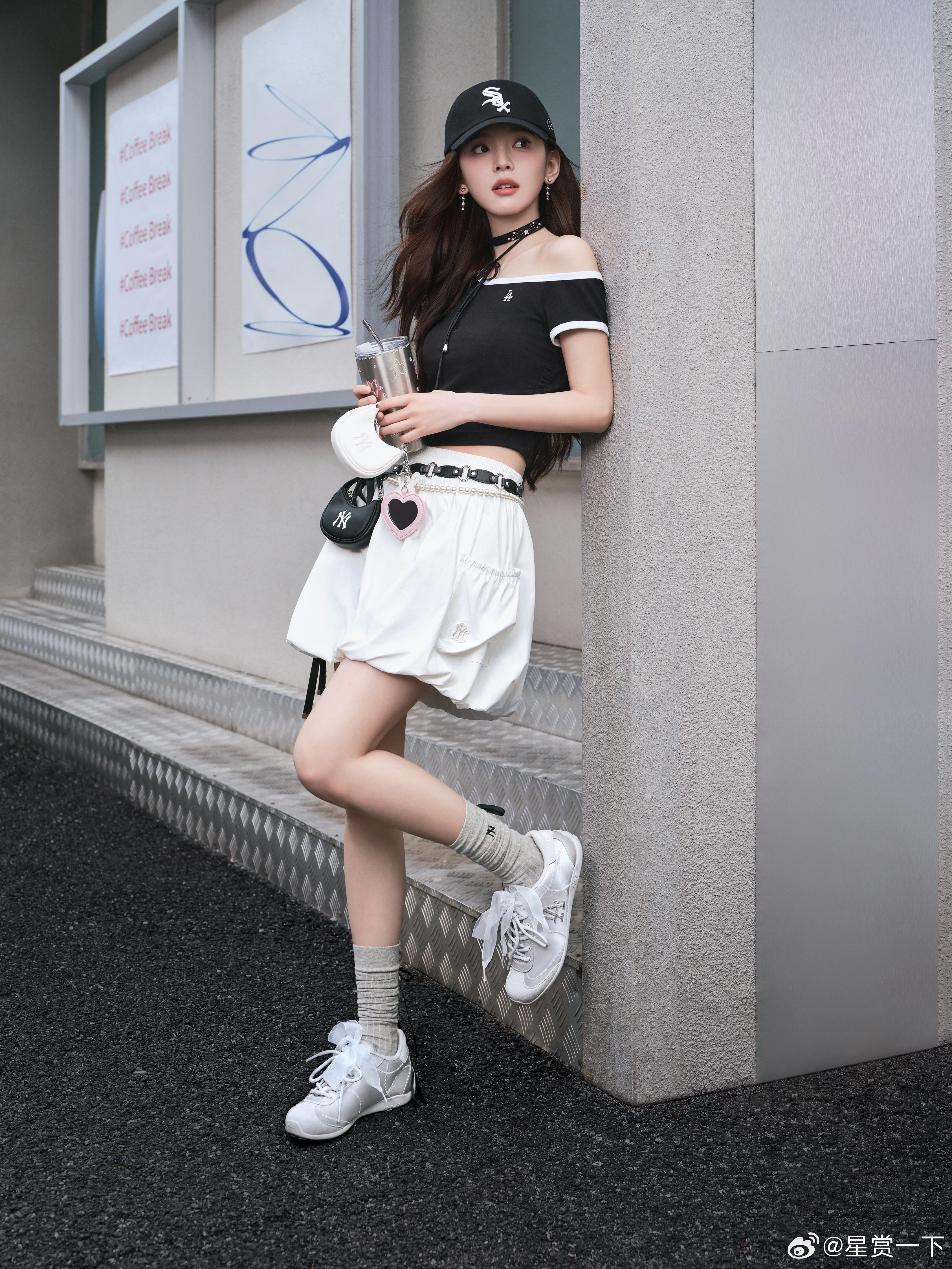 章若楠奶杏色抹胸裙揉碎了春日温柔,胸前立体蝴蝶结藏着恰到好处的娇俏,黑金撞色包