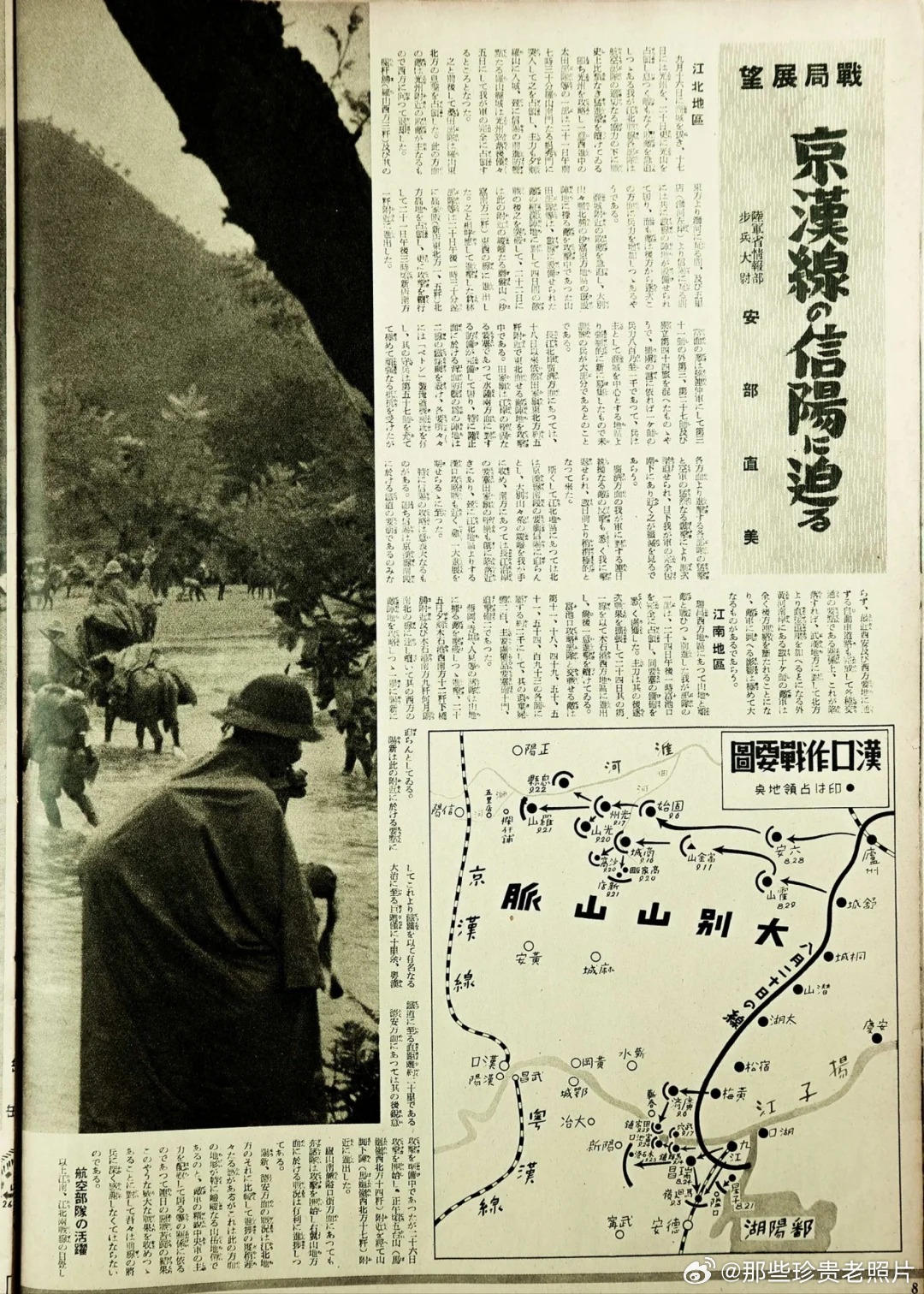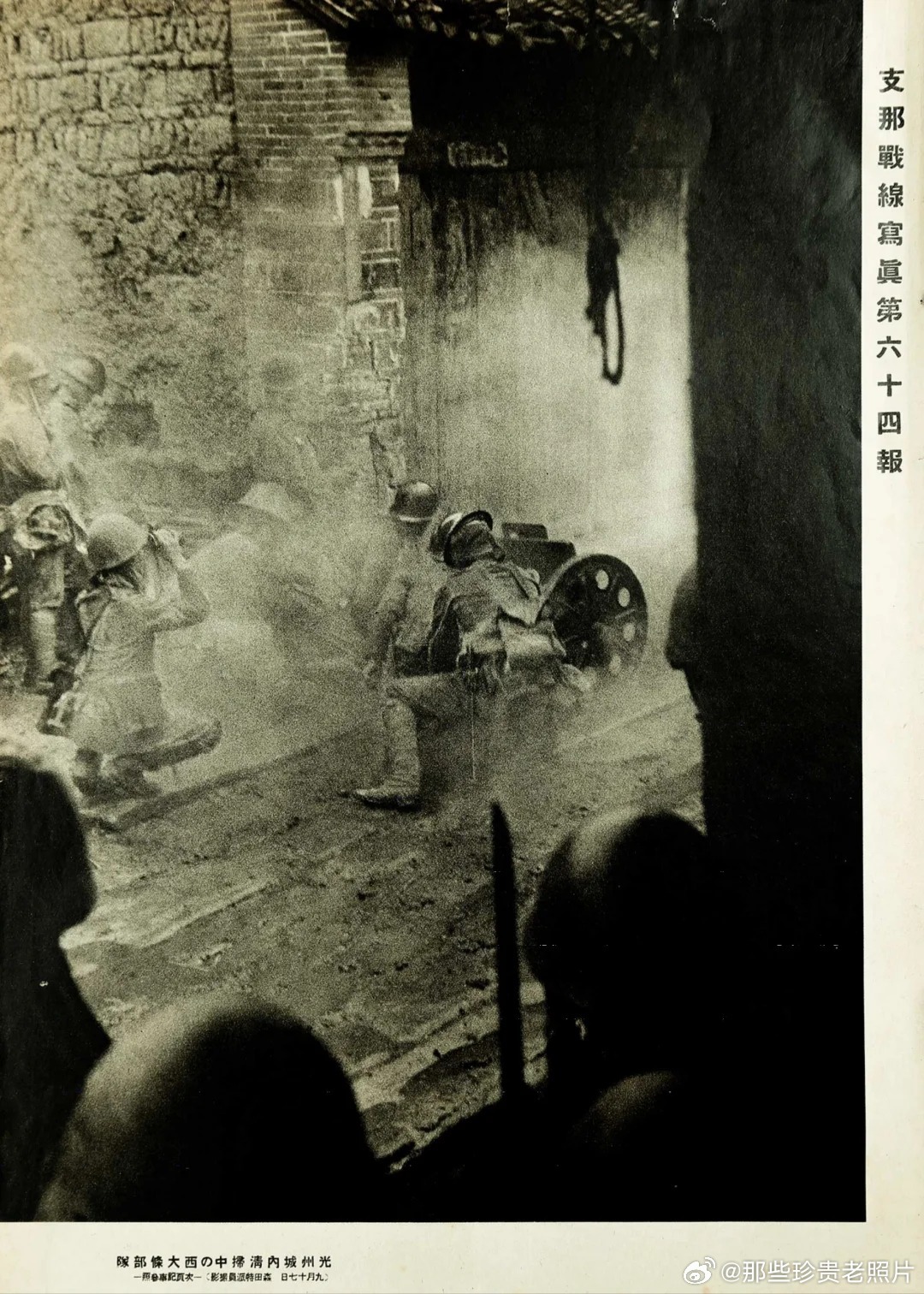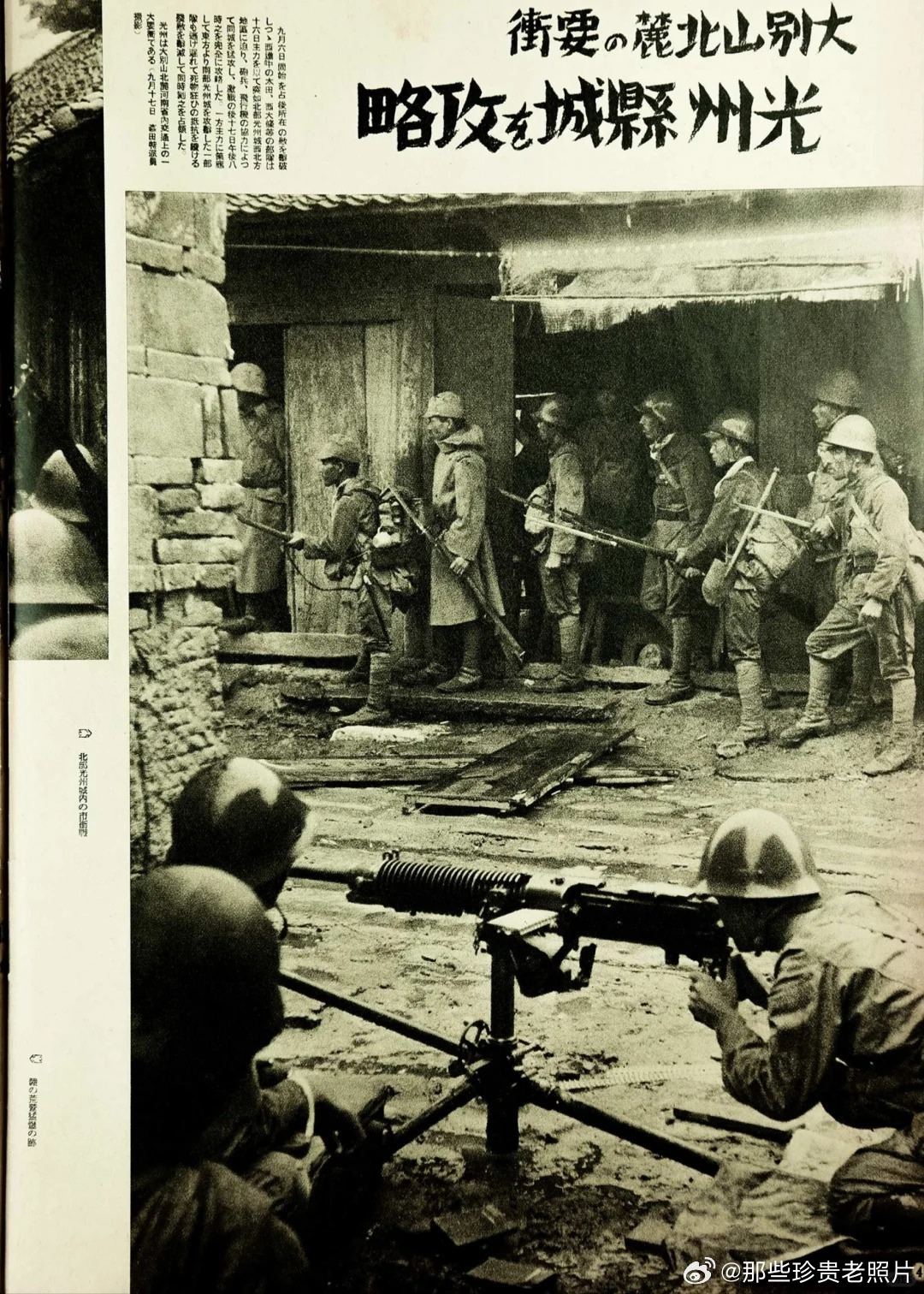 日军画报中的侵略武汉:占领光州、逼近信阳此为日本内宣杂志日中战线写真/日中战线写真第六十四报1938年10月12日出版民国二十七年十月十二日出版昭和十三年十月十二日出版封面:庐山南麓山顶开火的日军重机枪。图二:光州城内巷战的日军部队。(九月十七日)图三:攻略大别山北麓要冲光州县城图四:“扫荡”城内残敌图五:新店——泥海中猛进(九月下旬)图六:泥泞的大雨中燃烧植物取暖的日军图七:战局展望“京汉线进逼信阳”图八:九月十九日在冷雨中渡河向信阳进发的日军。