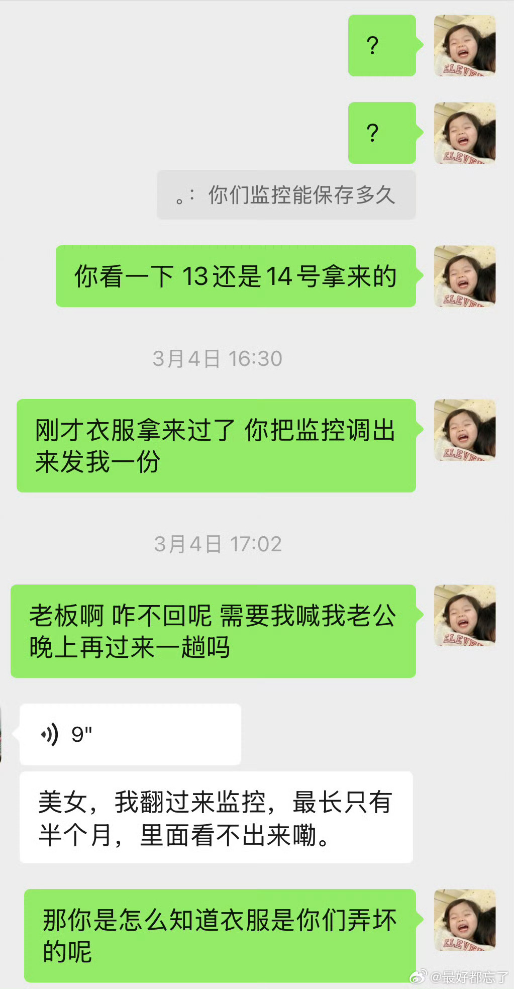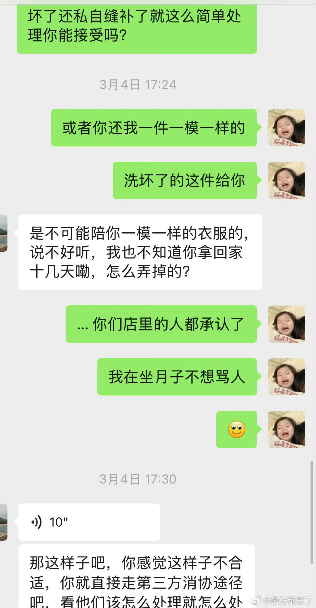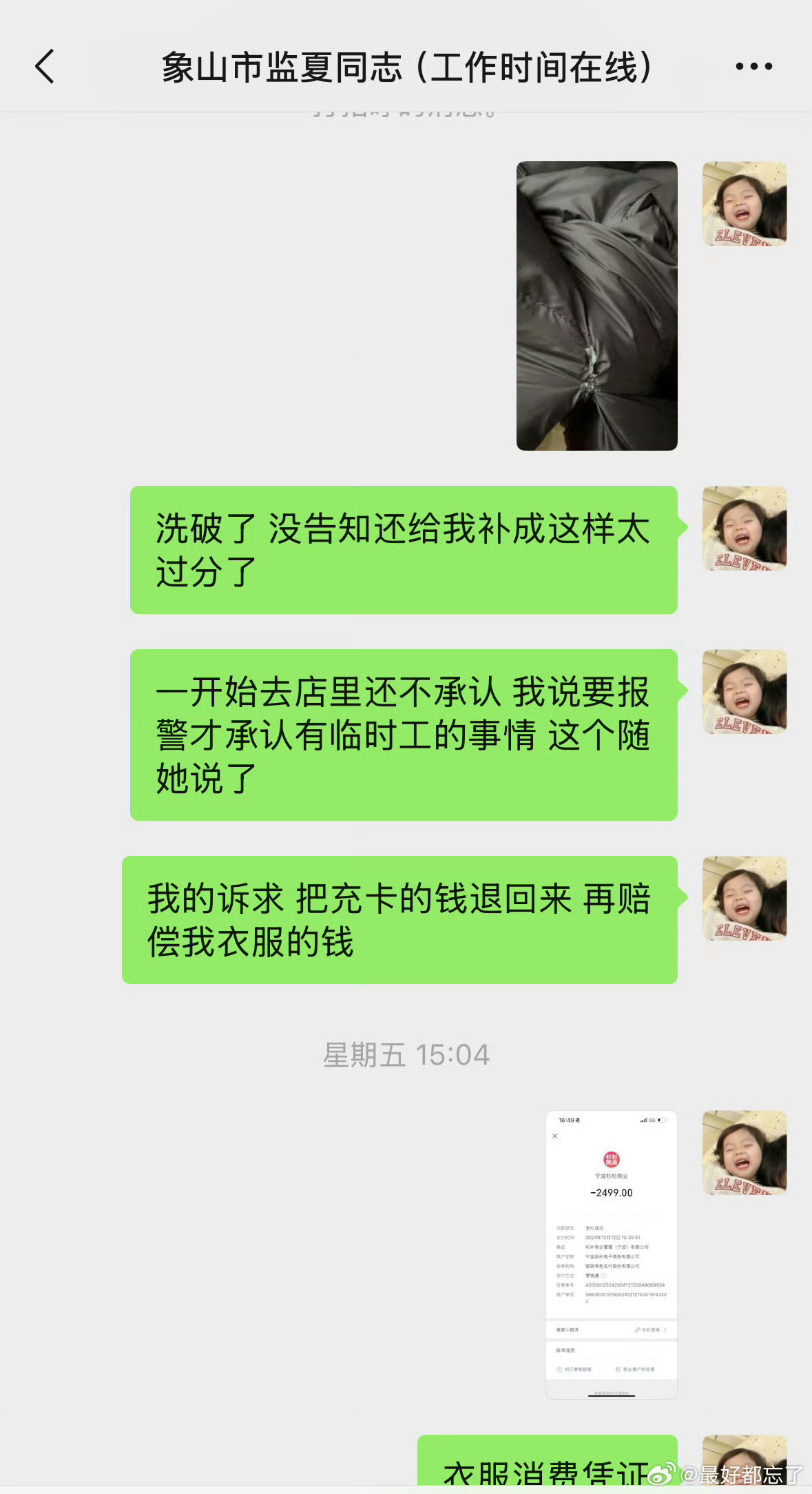 网友:最好都忘了投稿:普通百姓如何维权?本人于2026年2月3日在宁波象山洁丰干洗(文峰小区店)干洗了一件黑色长款羽绒服,2月13日取回,取衣时未检查。由于本人2月10之后一直在坐月子取回后也一直没机会穿。2月28日把衣服从袋子里拿出来发现衣服破损并有明显缝补痕迹,随后找商家理论(图2-4),负责人说不可能,就算洗破了店里也不可能给我补成这样(不承认),让我把衣服拿过去看一下,再找监控还原一下事发情况。3月4日我让亲属把衣服拿去干洗店,店内人员还是不承认,我说要报警,后面他们承认了,说是临时工操作的他们不知情推卸责任。他们给出了赔偿方案,把衣服拿去裁缝店重新缝补,我不同意,2499买的羽绒服(图6吊牌,图7消费凭证),就穿过几次,换成是你们会同意嘛?我又在微信上联系了负责人,他态度比较拽让我直接找第三方。最后我打了12315维权,象山市监协商了5天最后还是给我这么个结果(图8-9)