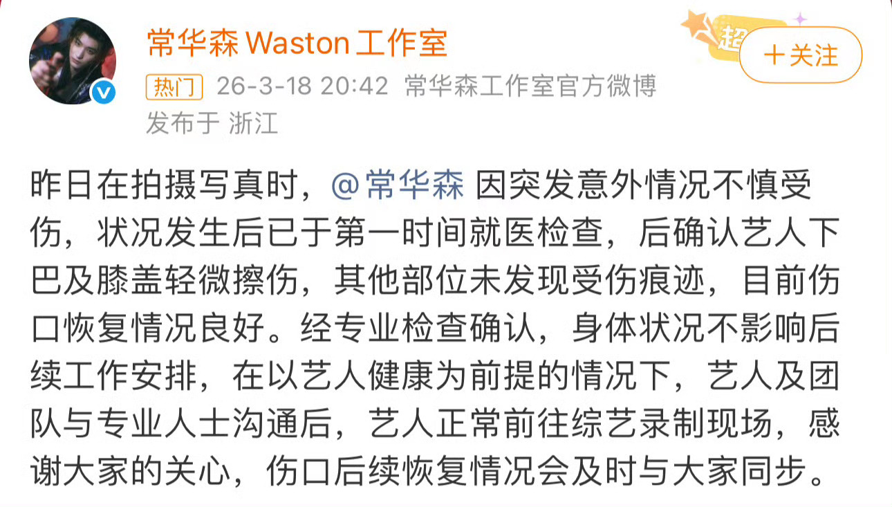 常华森表演后空翻摔到下巴常华森原来你下巴是这么摔的啊🙊!拍写真即兴表演后空翻,结果直接磕到下巴,又心疼又好笑!人没事就好,以后一定要注意安全呀哥~常华森