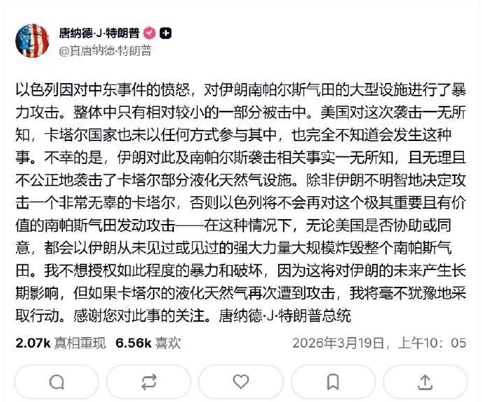 伊朗被激怒,要拉海湾油气重地陪葬,特朗普急忙发帖:美国不知情 据外媒报道,当地时间3月18日下午,伊朗南帕尔斯和阿萨卢耶部分石油化工设施遭到美以打击,该设施作为全球最大的天然气田之一,承担着伊朗超40%的天然气供应。据伊朗方面表示,这次袭击并未造成严重后果,打击所引发的火灾(图1)已被扑灭。美以袭击石化设施 伊朗称将以牙还牙 事件发生后,伊朗方面立刻誓言“以牙还牙”,将沙特、阿联酋和卡塔尔3国境内的与美国相关的石油等能源设施列为打击目标。据悉18日当晚,位于卡塔尔境内的全球最大液化天然气生产基地——拉斯拉凡工业城遭到伊朗导弹袭击后起火,热辐射强度直接超过了1400兆瓦,从远处看犹如小型核弹爆炸(图2)。 另外,沙特的利雅得油气联合炼油厂,这里的美方专属区域被伊朗导弹精准命中(图3)。据称,这次袭击可能直接导致美军的战机燃料补给流程陷入瘫痪。伊朗打击利雅得炼油厂美方专属区域 虽然目前阿联酋还没挨打,但这次伊朗恐怕是真被激怒了,看样子是要拉上海湾地区的油气重地“陪葬”。对此,特朗普急忙发帖,表示伊朗的打击不公平不合理,因为“美国对伊朗南帕尔斯气田遇袭一事完全不知情,这事是以色列的单独行为”(图4)。 以色列方面表示,对伊朗的相关打击事先跟美国协调过,而这次特朗普现在又说美国事先不知情,到底谁在说谎? 据悉,伊朗的南帕尔斯气田和卡塔尔的气田部分连接,而这次轰炸也确实波及到了卡塔尔的资产,这一点美国方面应该不会没有考虑,所以以色列确实有单方面行动的可能。 不过,如果以色列真的忽略美国而展开单独行动,这无疑是给了美国人一记响亮的耳光,更坐实了美国不敢忤逆以色列的说法。 另外值得一提的是,特朗普推文中还对伊朗发出了威胁,宣称如果伊朗再次对卡塔尔的天燃气设施发动打击,美国就会炸毁整个南帕尔斯气田。 但说实话,不管美国参没参与以色列的这次打击,伊朗将与美国相关的能源资产列为打击目标都是合理的,而特朗普既想撇清责任,又想不丢面子,所以对伊朗发出这种威胁,这是不太明智的,伊朗现在是吃软不吃硬,美以叫嚣威胁的越狠,伊朗的报复也会越狠。