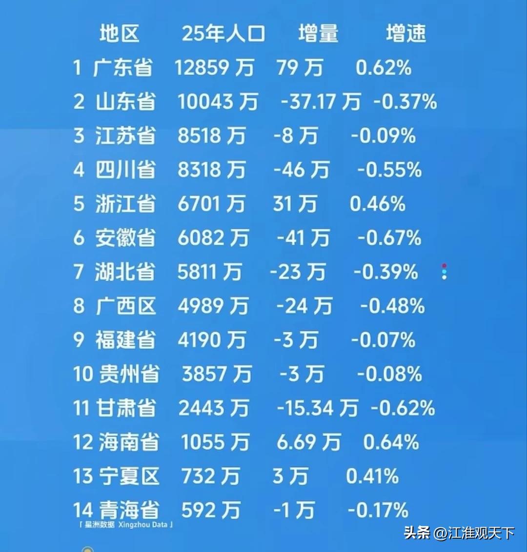 粵苏鲁浙闽5省,只有广东和浙江常住人口数据是增加的 5个沿海经济大省,广东,江苏,山东,浙江,福建,省强民富,也是沿海发达地区,多年来,它们大多都是人口纯流入地,因为其外向型经济发达,能够提供大量就业岗位。 2026年,5省统计局发布的人口数据,山东,江苏,福建都是人口在减少,只有广东和浙江常住人口数量是增加的。 1.广东,常住人口1.28亿人,增加79万人 2.山东,常住人口1.043亿人,减少是37.17万人 3.江苏,常住人口8518万人,减少8万人 4.浙江,常住人口6701万人,增加31万人 5.福建,常住人口4190万人,减少3万人。人口数量分布图 人口净流入省份 人口大排行 广东人口流出 常住人口数据 广东性别比