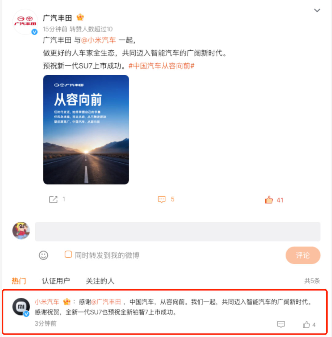 广汽丰田给小米SU7送祝福,小米汽车直接点名回祝全新铂智7,这一次啊,是把铂智7
