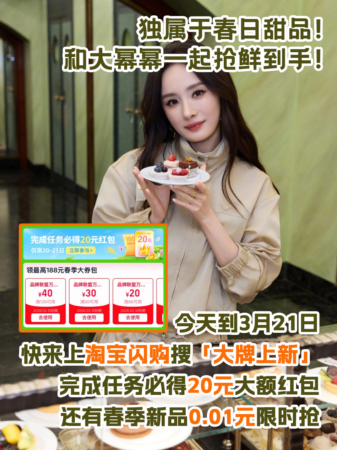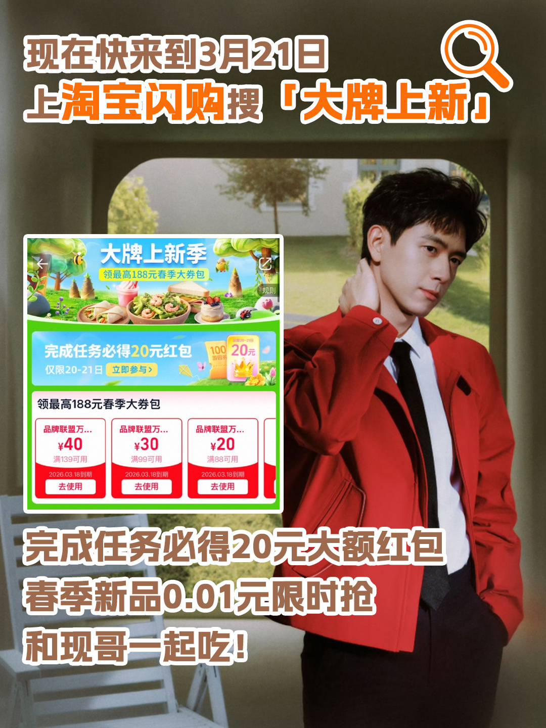 🔥杨幂+李现+汪苏泷+AG+吴艳妮=你的钱包有救了!这是什么梦幻联动?淘宝闪购明星天团,全员就位!他们聚在一起只为一件事:喊你3月20日至3月21日,上淘宝闪购🔍「大牌上新」完成任务首次必得20元大额红包——幂姐现哥让你M门永存!春季新品0.01元限时抢——快来上个闹钟⬇️⏰上午10点&12点 抢0.01元通兑券+春日限量香片🎁⏰下午16点&20点 抢0.01元通兑券+8.9爆品团美食😋五位抢鲜大使,五倍快乐叠加!速来抢鲜~和淘宝闪购明星天团抢春季新品淘宝闪购大牌上新季 淘宝闪购