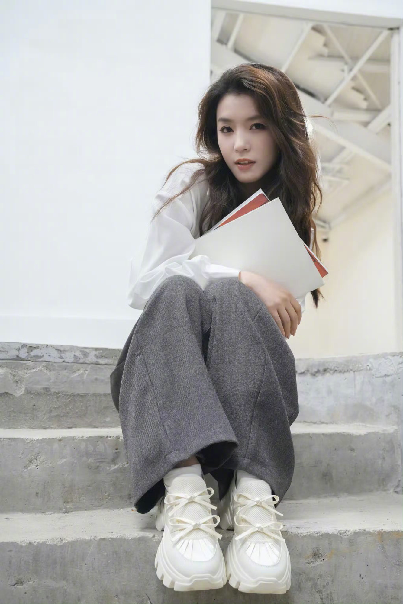 生活随拍亮相,白色雪纺衬衫、灰色休闲裤与小白鞋组合,呈现简约松弛的慵懒风格。整体