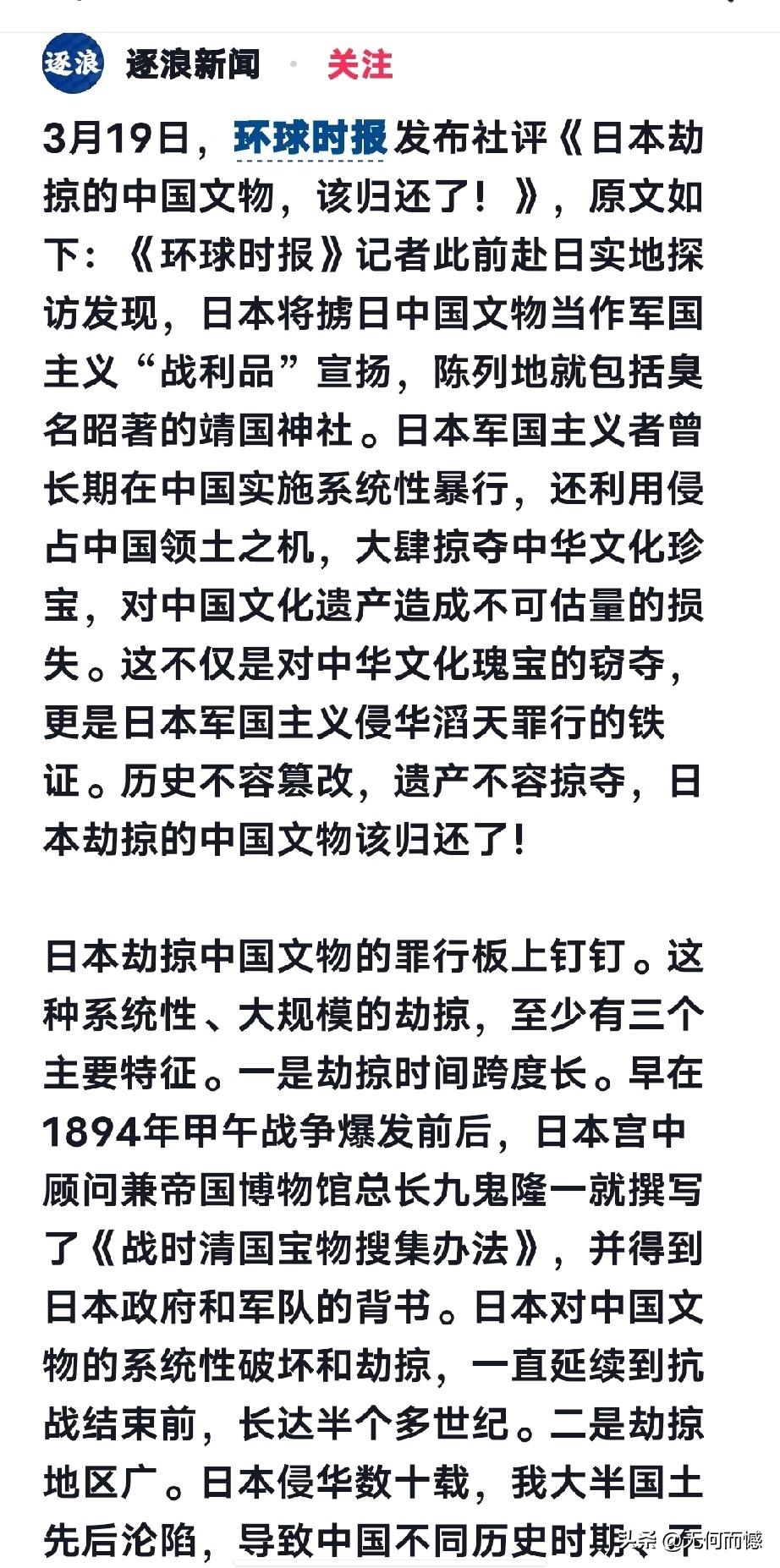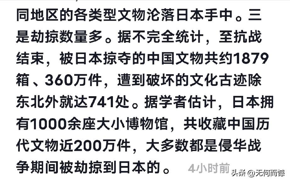 日本,欠中国的文物该还了!从甲午战争到抗战结束,半个多世纪里,日本像强盗一样,把咱们360万件文物、1879箱宝贝抢回了国,还把这些赃物当“战利品”摆在靖国神社炫耀,以1000多个大大小小的博物馆,简直是无耻到了极点! 这哪是收藏?分明是明火执仗的抢劫!是刻在骨子里的侵略罪证!他们把咱们的文化瑰宝偷去,还想篡改历史、美化侵略,做梦!历史不容篡改,被抢的东西必须还!日本欠咱们的这笔血债,别想赖掉!赶紧把掠夺的中国文物还回来,这是天理,也是公理