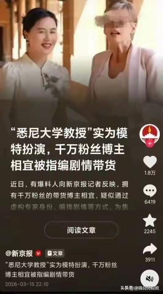 千万网红相宜翻车!"悉尼大学教授"竟是演员,市监部门已介入 2026年3月,抖音千万粉丝博主相宜被曝带货造假。新京报调查显示:同一女子在直播间先后扮演"都市丽人老板娘"等多个品牌负责人 ;外籍演员受雇扮演"悉尼大学教授",5小时获750美元报酬 ;留学生被包装成"云养骆驼"游客 ;此前还涉及驼奶粉功效夸大、绵羊油产地造假等问题 。目前相宜团队正配合市监部门调查 。 深度解析: 法律专家指出,虚构身份为产品背书已涉嫌虚假宣传 。3月15日发布的调查报告显示,35.8%的消费者遭遇过虚假宣传 。3月20日,直播电商新规将正式施行,压实各方主体责任 。抖音去年已清退严重违规达人超27万名 。 唤羽师观点: 35.8%的数字背后,是无数"相宜"在透支行业信任。流量靠"演",信任靠"真"。那些编剧本的人,该醒醒了。相宜网红 抖音带货曝光 网红带货危机 明星带货矛盾 名人带货翻车 艺人带货翻车 老戏骨带货争议