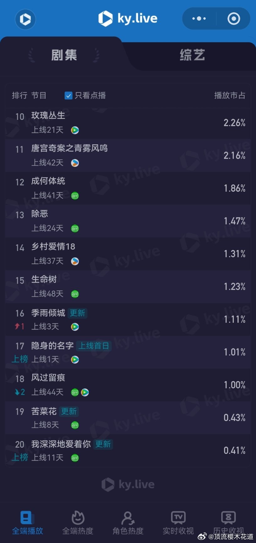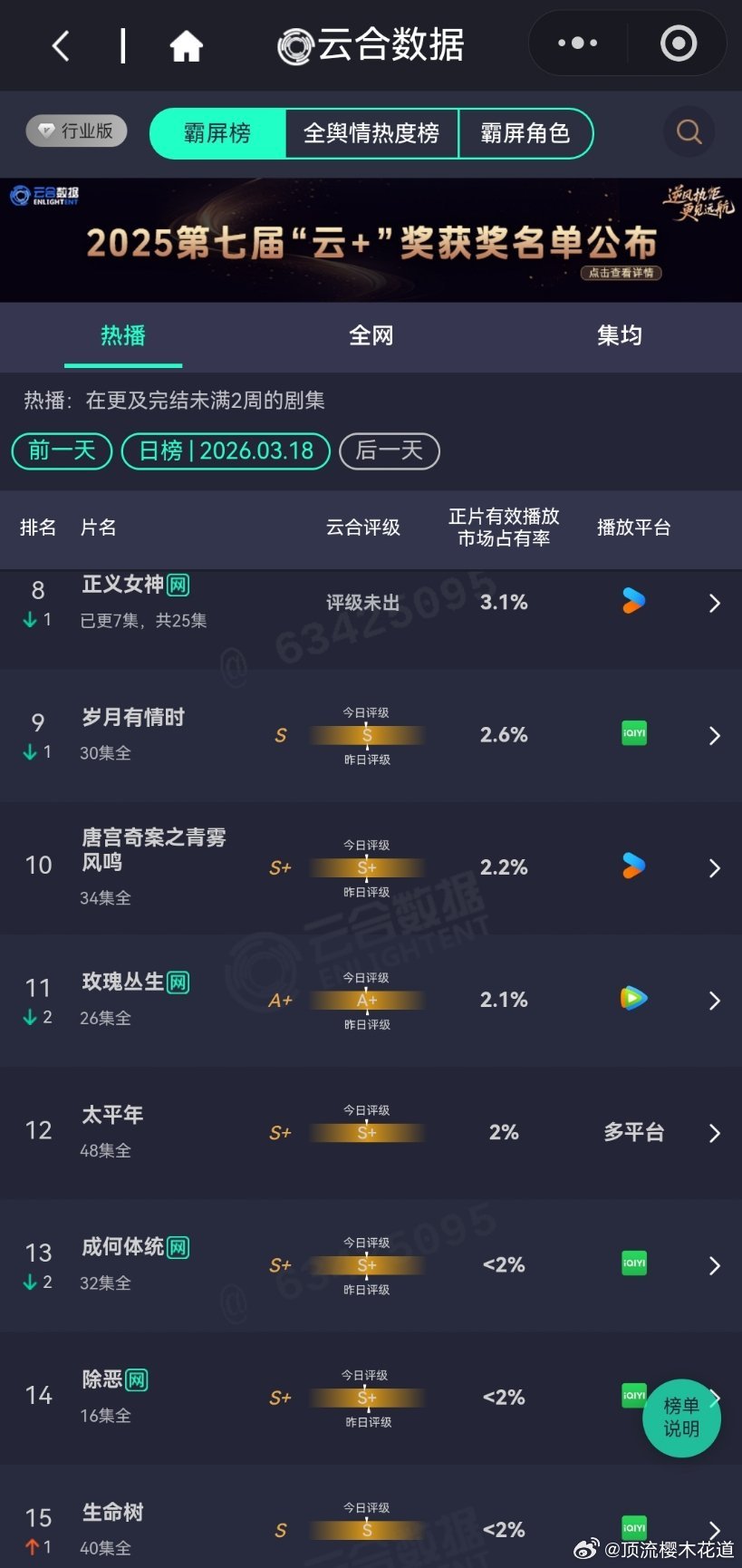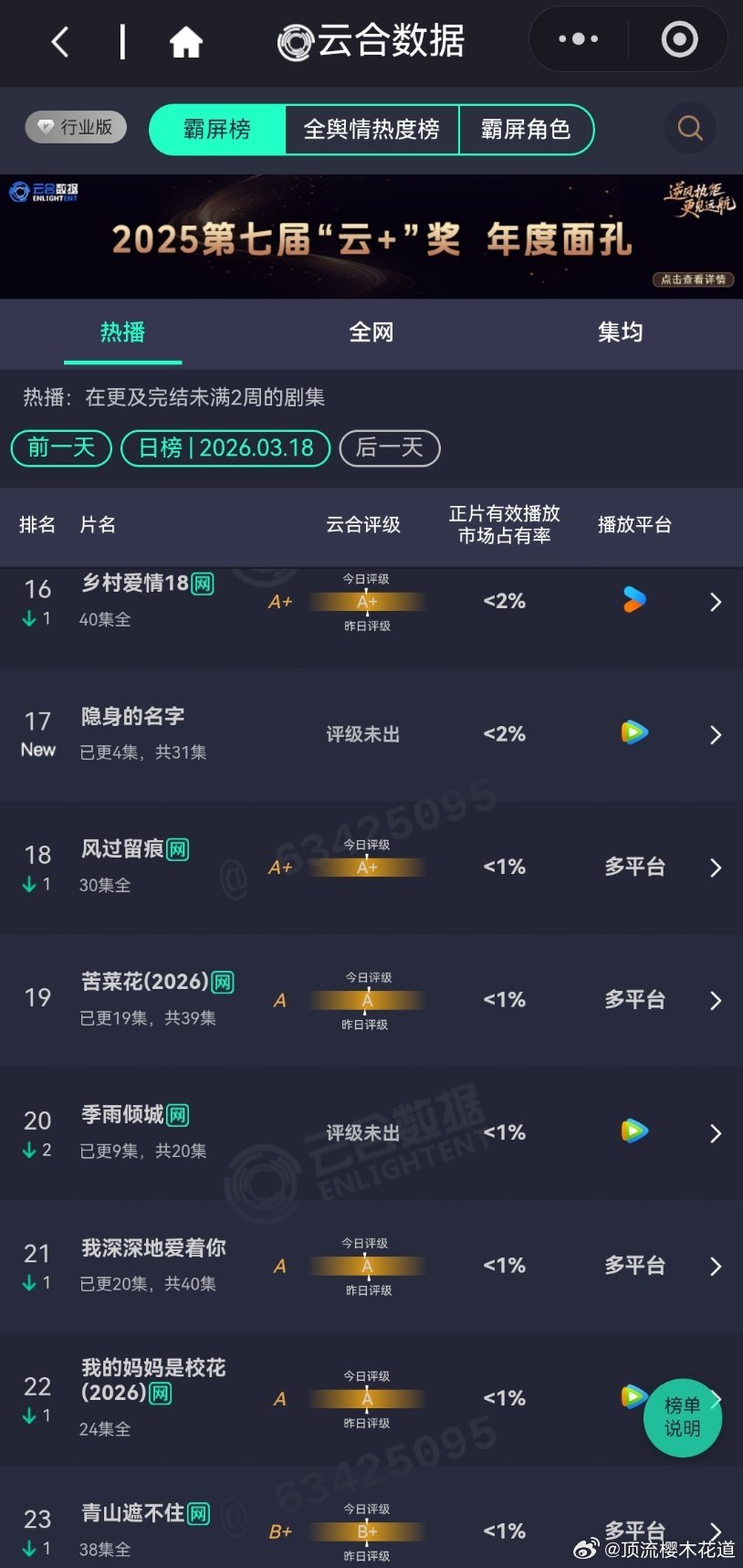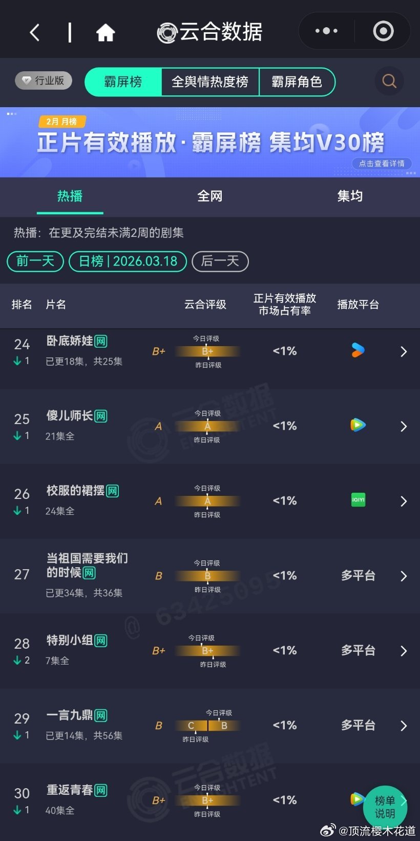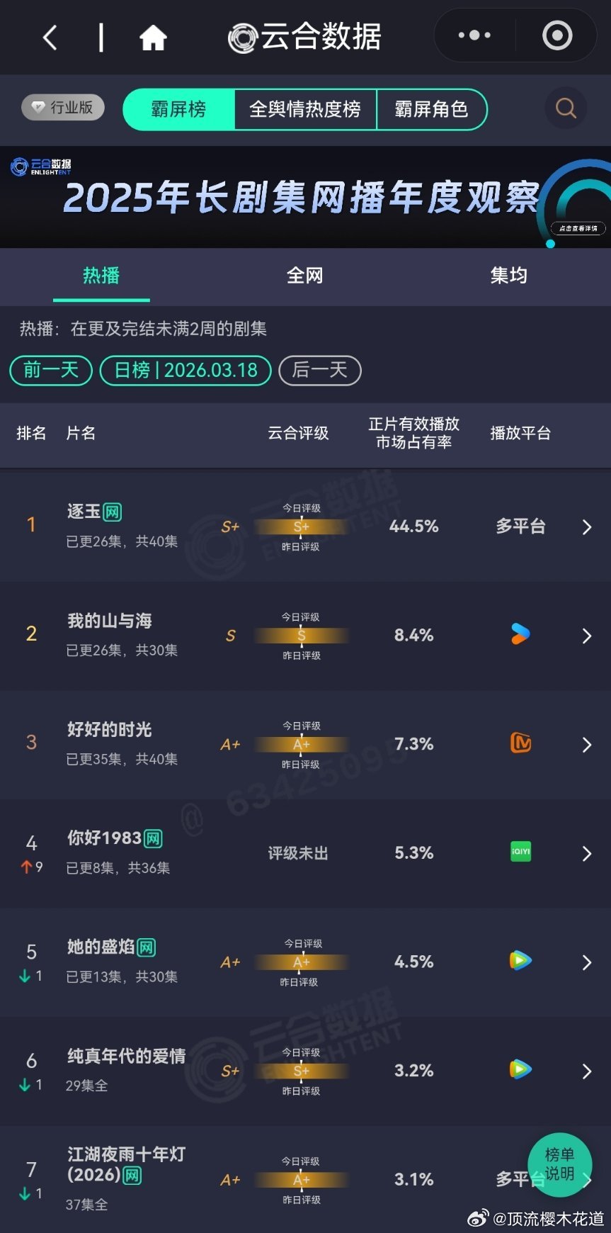 3月18日云合播放占比云合 VS酷云这两张表的数据现在只能做参考了,看看就好。
