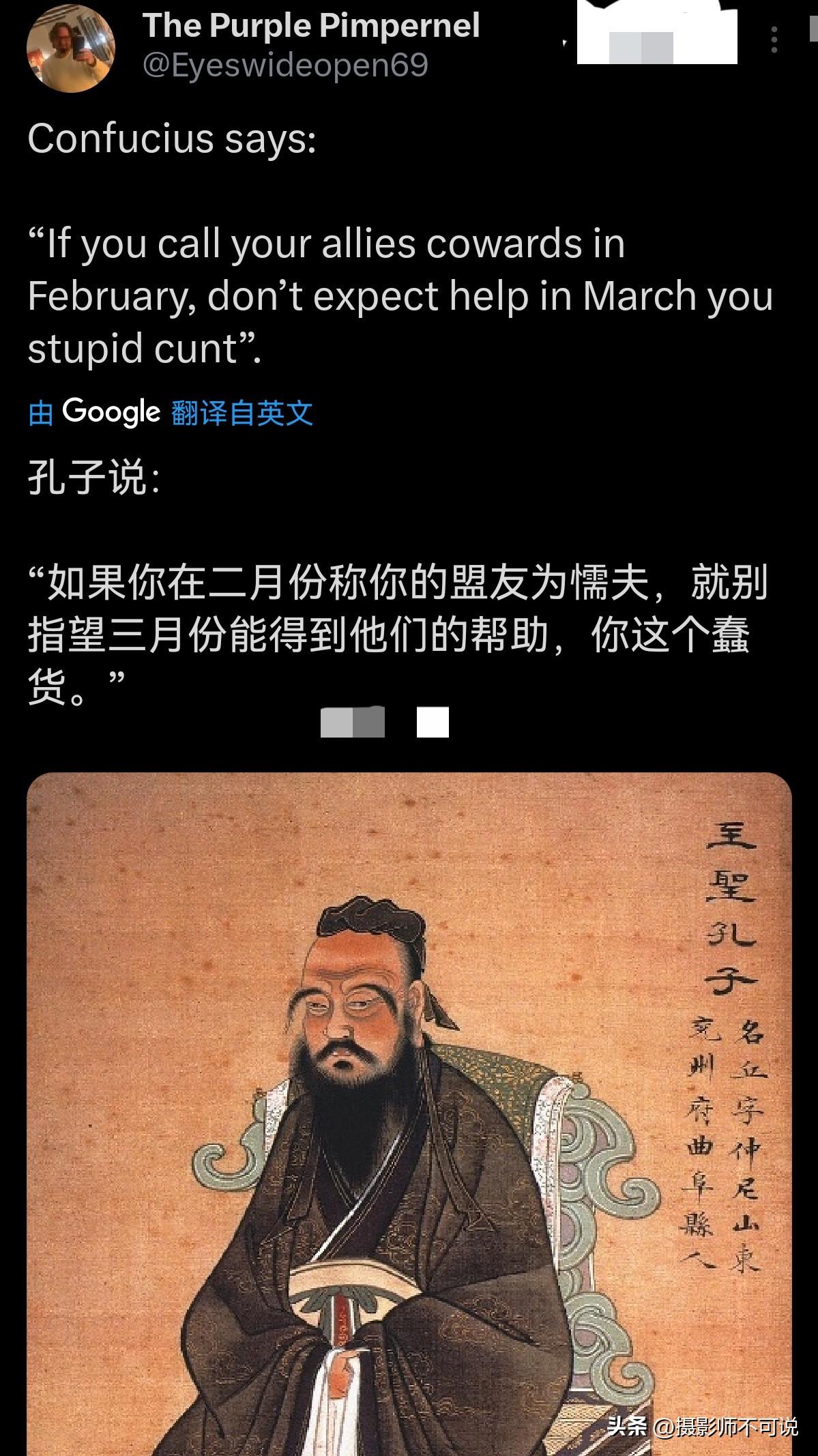孔子在外网上好像越来越火了,隔三差五就能出现以孔子之名说一些莫名其妙的话出来,以后是不是又要出一本《论语.赛博篇》了!比如这位居然假借孔子之名说“如果你在二月份称你的盟友为懦夫,就别指望三月份能得到他们的帮助,你这个傻子”。哈哈,这句话的意思够明白了吧,某人被骂得很惨,感觉就是孔子他老人家这几天才参照国际局势说的吧?[捂脸]